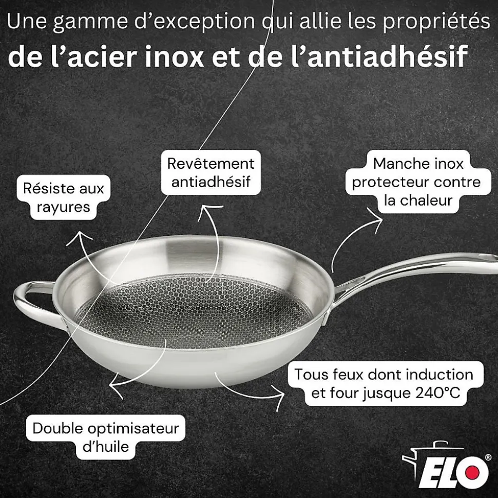 - DESCRIPTION: Le wok 30 cm Elo Relief Evolution allie les avantages d’un wok en acier inoxydable à ceux d’un wok antiadhésif ; parfait pour une cuisson croustillante et saine