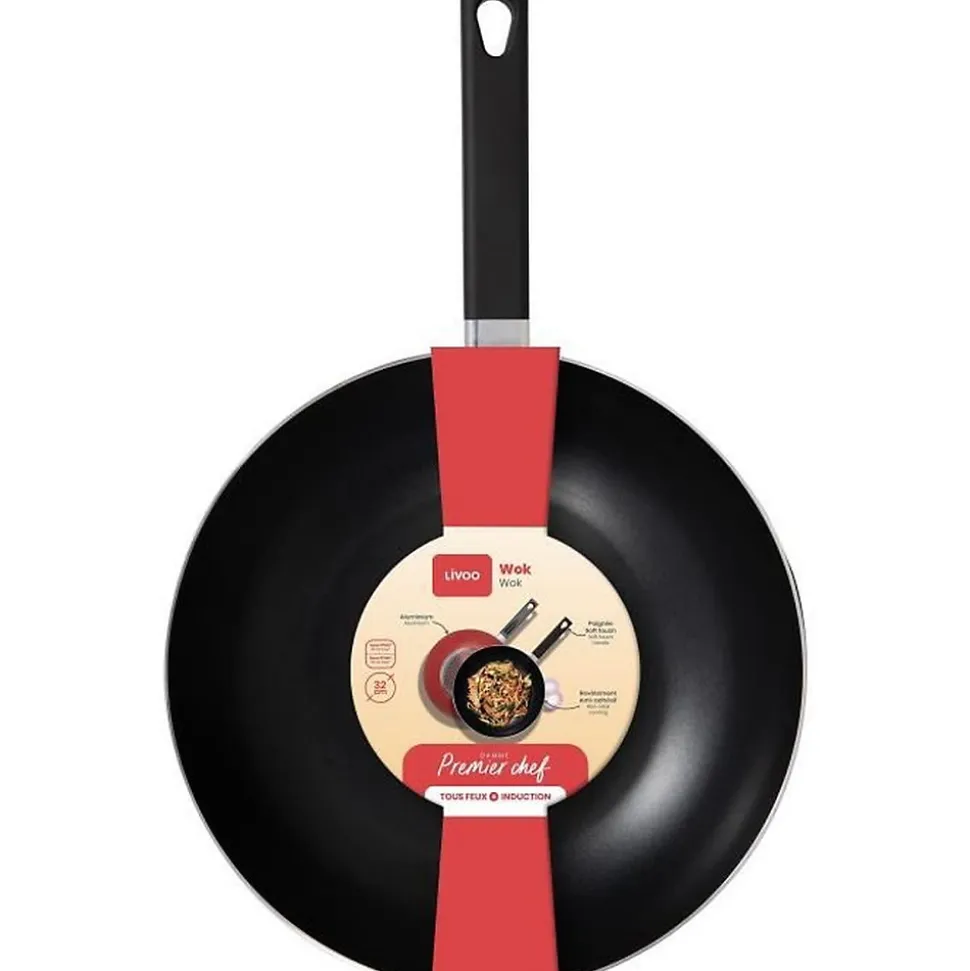 Wok Livoo 32 cm en aluminium avec revêtement antiadhésif sans PFOA ni PFOS, fond inox dimpled compatible induction, manche soft-touch en silicone résistant à la chaleur, compatible tous feux et lave-vaisselle. Léger, robuste et idéal pour sautés et cuissons quotidiennes. Modèle MEP156R.