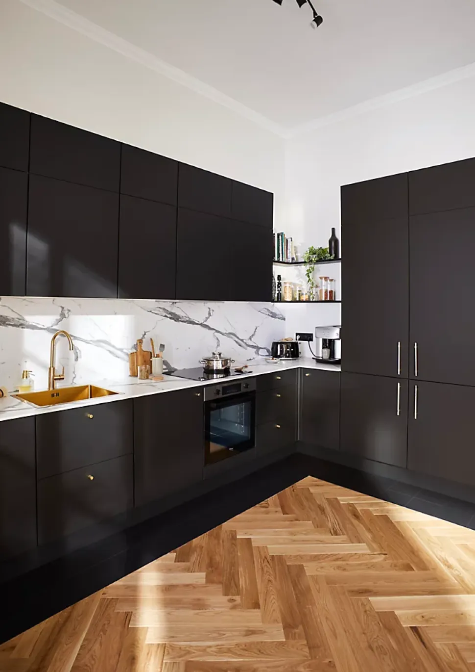 Notre gamme présente les dernières tendances en matière de styles, de couleurs et de finitions de porte. Le tout se coordonne parfaitement avec le reste de notre gamme GoodHome pour la cuisine. La gamme de portes stevia inclut à la fois des finitions brillantes qui reflètent la lumière et la couleur de votre mur et une finition mate qui limite les traces de doigts et les imperfections, tout en créant une finition uniforme sous tous les angles. La finition noir mat élégante de cette façade confèrera à votre cuisine un aspect moderne.
