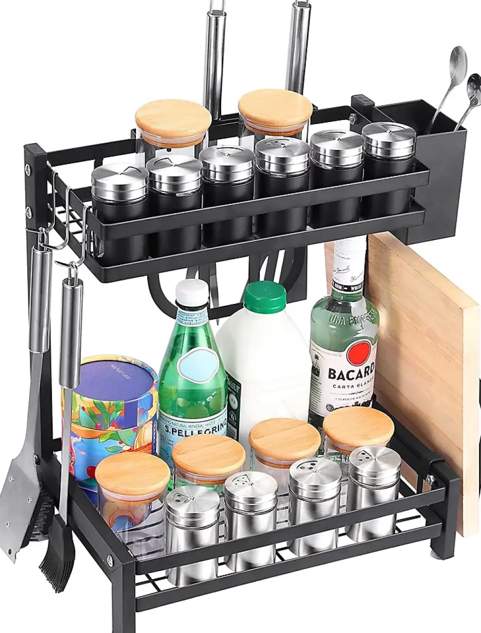 【Porte-Épices à 2 Étages】 Le support de stockage à épices à 2 niveaux convient pour garder vos bocaux, contenants, condiments, canettes et épices à portée de vue et à portée de main lors de la cuisine ou de la cuisson. IIl est utile pour économiser l’espace et de rendre le plan de travail propre beaucoup plus facile et efficace.【Construction Robuste et Durable】 Le support à épices JiGiU pour comptoir est fabriqué en acier inoxydable 201 robuste, ce qui le rend robuste, étanche et facile à nettoyer. Les pieds antidérapants de ce porte-épices de stockage l’empêchent de bouger ou de glisser.【Accessoires Pratiques】 Ensemble complet est combiné avec 3 crochets pour suspendre les gants, le chiffon, la spatule, les ciseaux; 1 porte-couteau pour couteau de cuisine; 1 support pour planche à découper ou couvercle de casserole; 1 porte-ustensiles pour fourchettes, couteaux, cuillères, ustensiles de cuisine, etc.【Facile à Assembler et Détachable】 Facile à installer, l’organisateur de comptoir de cuisine est assemblé en une minute et est facilement détachable pour le nettoyage quotidien. L’instruction est incluse.