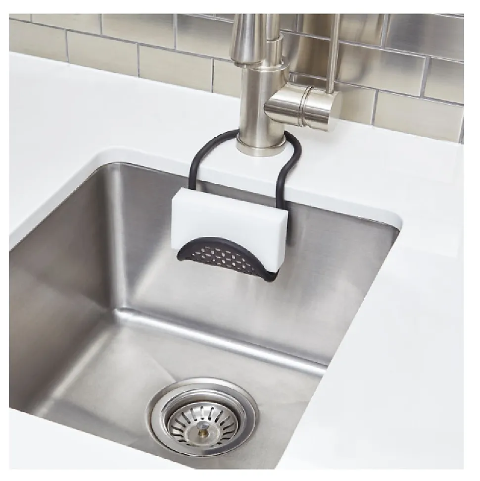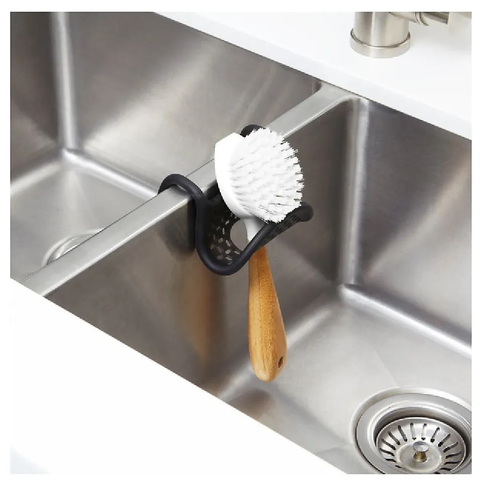 Ce Porte-éponge flexible peut se plier pour s’adapter à n’importe quel paroi ou robinet d’évier. Doté d’une structure en fil de fer avec un revêtement moulé flexible antidérapant et élastique, il restera bien en place pendant que vous faites votre vaisselle. Le porte-éponge possède une grande ouverture pour accueillir une brosse à vaisselle et est percé d’ouvertures plus petites pour empêcher l’accumulation d’humidité, garantissant que votre éponge, votre lavette ou votre brosse à vaisselle restent propres et sèches. Matière : Plastique Couleur : Noir Longueur : 26 cm Largeur : 11 cm