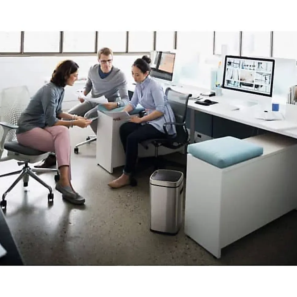 Poubelle avec capteur de mouvement pour une ouverture sans contact. Poubelle pour une utilisation sans contact grâce à la technologie des capteurs Ouverture par capteur de mouvement et fermeture automatique, ou bien manuelle par touches d’ouverture/fermeture Seau intérieur amovible avec anse et fixation de sacs Couvercle amovible pour faciliter le vidage Fermeture silencieuse et en douceur du couvercle Corps extérieur en acier inoxydable avec revêtement anti-traces de doigts Socle antidérapant et forme carrée pour économiser de la place Nécessite 4 piles AA (non incluses) Capacité : 35 litresDimensions extérieures : 30,5 x 30,5 x 69 cm