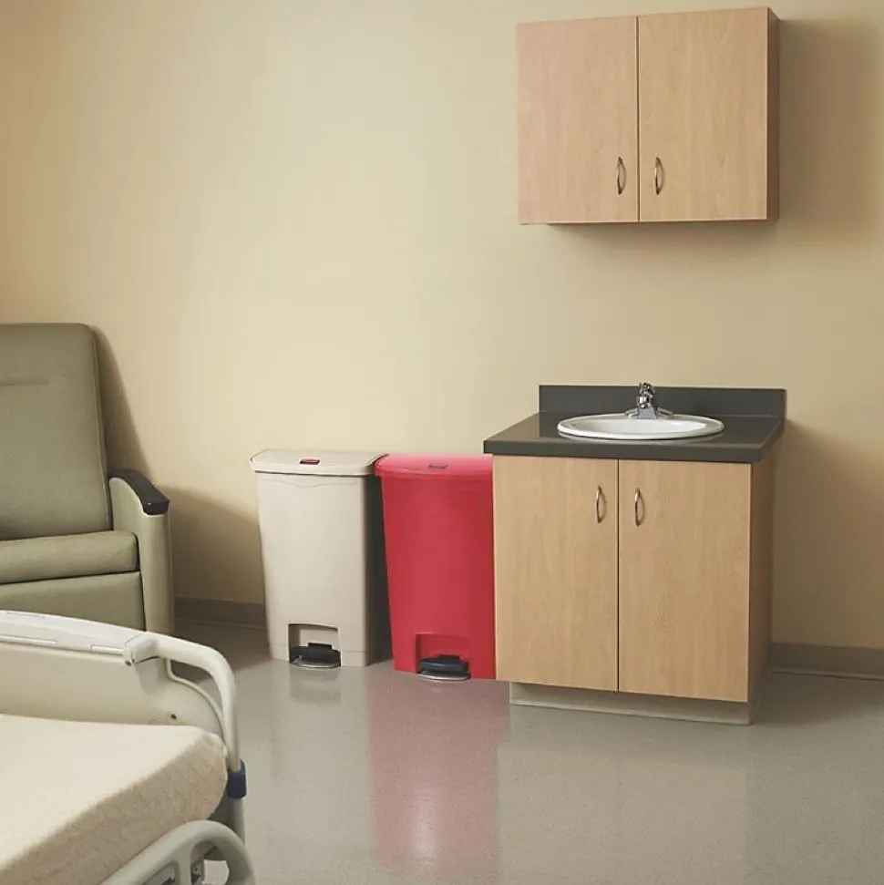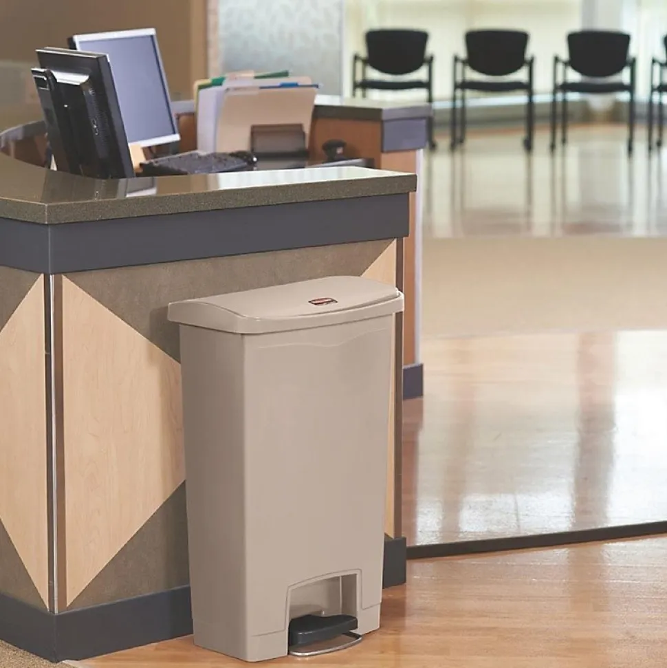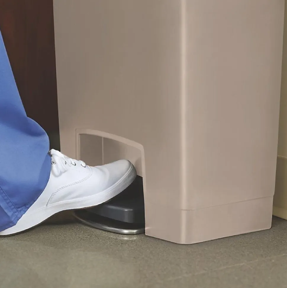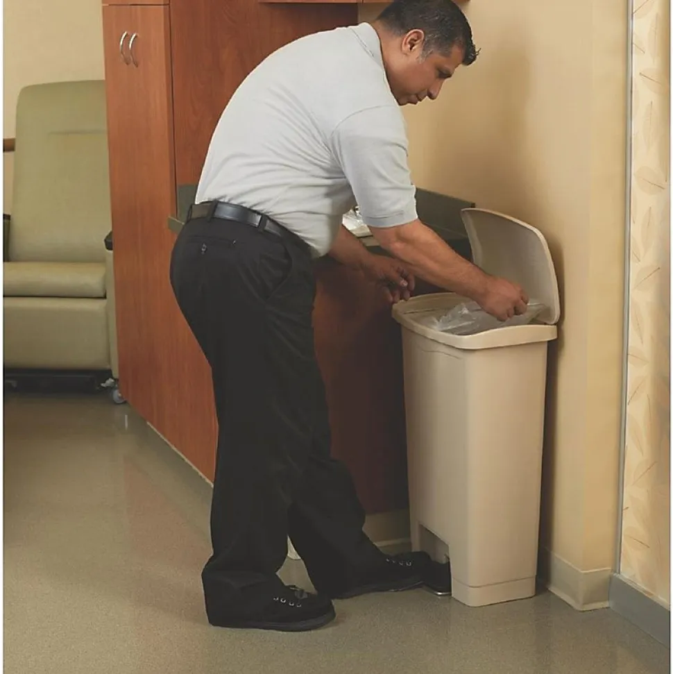 Poubelle à pédale Rubbermaid La poubelle à pédale Slim Jim mains-libres vous feront gagner de l’espace grâce à un design à encombrement réduit, compact et discret. Il contient une pédale ultra résistante conçue pour une utilisation professionnelle sur la durée et un couvercle à fermeture silencieuse parfaitement hermétique pour un environnement sain et agréable.Couleur : BeigeCapacité: 50LDimensions: 719(H) x 457(L) x 292(P)mmMatériel: Résine polyéthylènePoids: 4,96kgMécanisme en retrait protégeant murs et équipements à proximitéCertifié TÜV