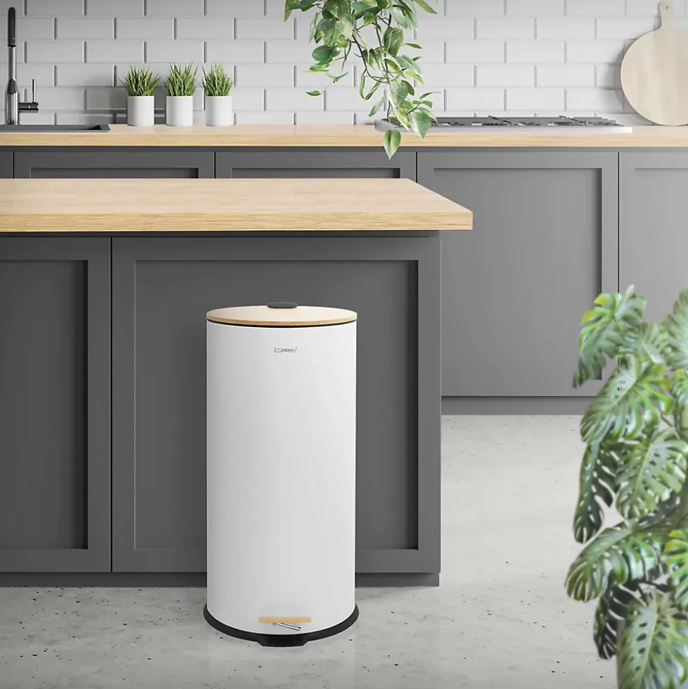 Poubelle à pédale – 30 litres, blanche avec couvercle en bambouCette élégante poubelle allie fonctionnalité et design avec élégance. Avec son corps blanc mat et son couvercle ainsi que sa pédale à l’aspect bambou élégant, elle apporte une chaleur naturelle et une simplicité moderne dans chaque cuisine ou salle de bain.Grâce au mécanisme Softclose, le couvercle se ferme en douceur et sans bruit – idéal pour un environnement calme et agréable. La pédale permet une utilisation hygiénique et confortable sans avoir à toucher le couvercle avec la main.Un seau amovible se trouve à l’intérieur, ce qui rend le vidage et le nettoyage particulièrement faciles. Avec une capacité de 30 litres, la poubelle offre suffisamment de place pour les déchets ménagers quotidiens et convainc en même temps par sa finition de qualité en acier revêtu par poudre et en bambou durable. AvantagesHygiénique & confortable: ouverture par pédale – pas de contact manuel nécessaire.Couvercle Softclose: fermeture lente et silencieuse.Design naturel: combinaison de blanc mat et d’aspect bambou.Facile à entretenir & robuste: corps en acier revêtu par poudre avec une surface de haute qualité.Pratique: seau intérieur amovible pour un vidage et un nettoyage faciles.Antidérapant: Stable grâce à une base et une pédale stables. Livraison1x Poubelle à pédale (30 litres)1x Seau intérieur amovibleManuel d’utilisation Information techniqueMatériaux:Seau: acier avec revêtement en poudreCouvercle et pédale: bambouCouleur & aspect:Seau: blanc, matCouvercle & pédale: marron, aspect bambouVolume: 30 litresFonctions:Pédale avec couvercle softcloseSeau intérieur amovibleDimensions:Total: P 37 × L 29 × H 62,5 cmDimensions intérieures: Ø 27,5 × H 52,5 cmPédale: P 4,5 × L 9,5 × H 0,8 cm
