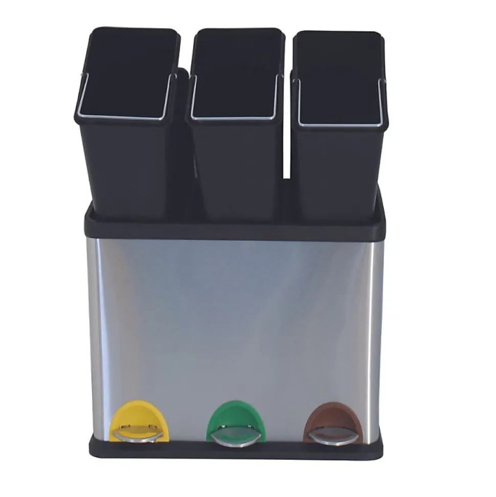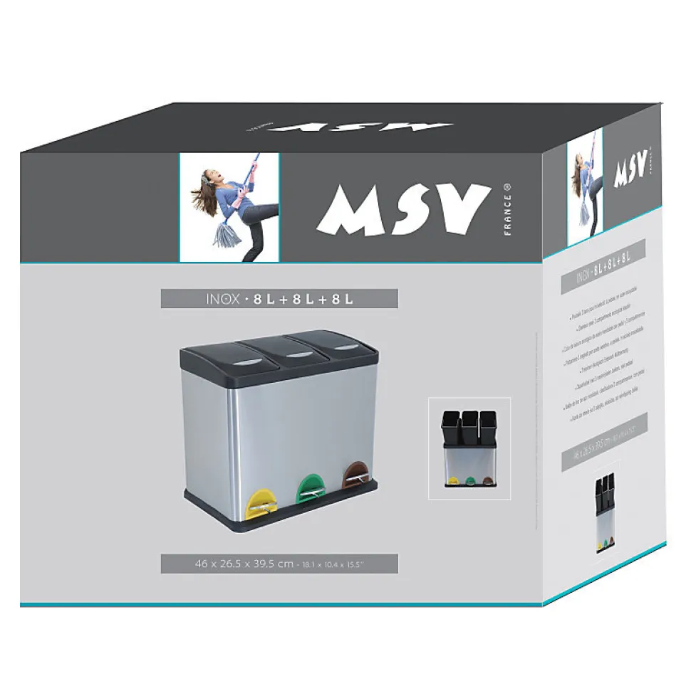 Poubelle de la marque MSVSéparateur de déchets permet de trier facilement les déchets. Utilisé au quotidien, cette poubelle s’avère être très robuste et silencieuse.3 contenants de 8L chacun, parfaits pour la séparation des ordures rapide. Convient pour une utilisation en intérieur: cuisines, bureau … ou en extérieur: caves, Jardin, etc. La poignée de transport pratique au dos facilite le transport. Les seaux intérieurs et le boîtier se nettoient facilement à l’eau ou avec des nettoyants ménagers.UN JEU D’ENFANT: La poubelle est facile d’utilisation grâce aux trois pédales antidérapantes qui en faciliteront l’ouverture. De plus, les couleurs sur les pédales vous permettront de trouver le bon endroit où jeter vos déchets. C’est également un bon moyen d’apprendre les bases du recyclage à vos enfants.POUBELLE ERGONOMIQUE: La poubelle est un vrai plus dans votre maison. En effet, grâce à son couvercle ingénieux, elle retient les mauvaises odeurs à l’intérieur et vous laisse ainsi profiter de votre intérieur.MATÉRIAUX DE QUALITÉ: La poubelle est constitué d’acier inox de qualité supérieure garantissant une longue durée de vie ainsi qu’un aspect sobre et élégant. Les seaux amovibles, constitués de plastique recyclés, sont faciles à nettoyer et vous confère une utilisation de plus sereine.Dimensions: 46×26.5×39.5cm Couleur: Inox Matière: Inox