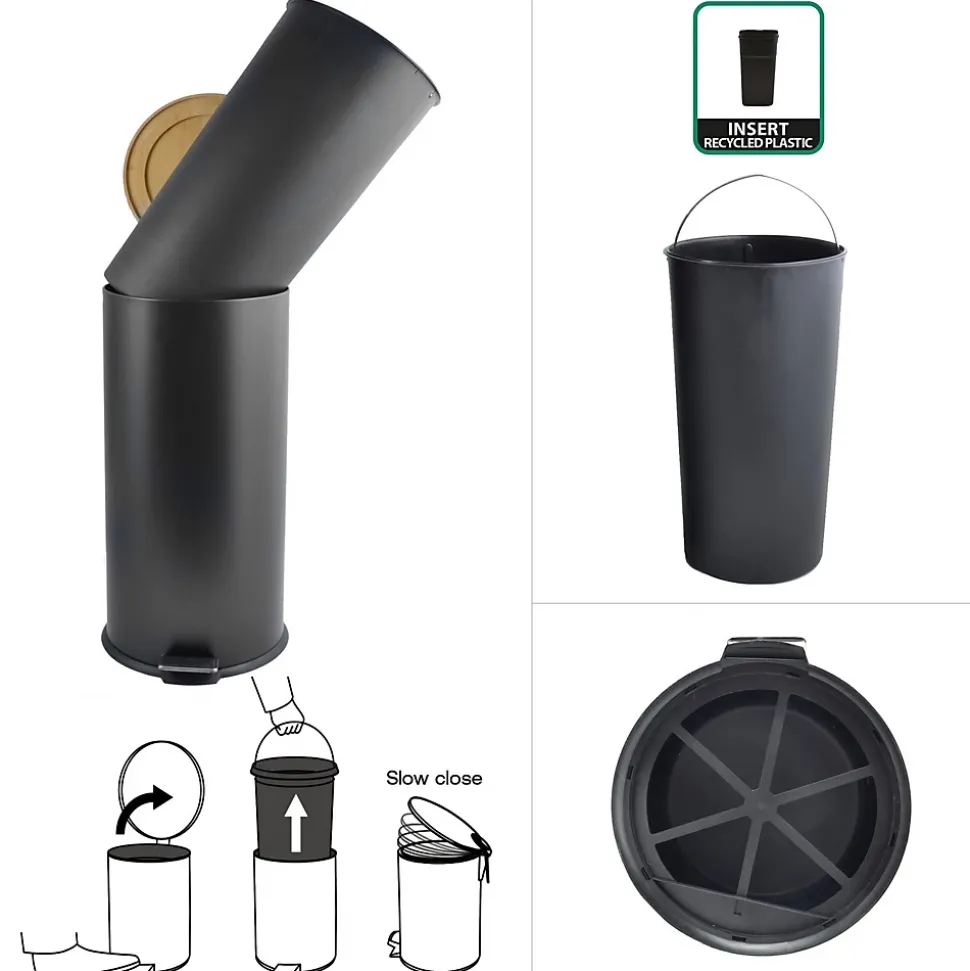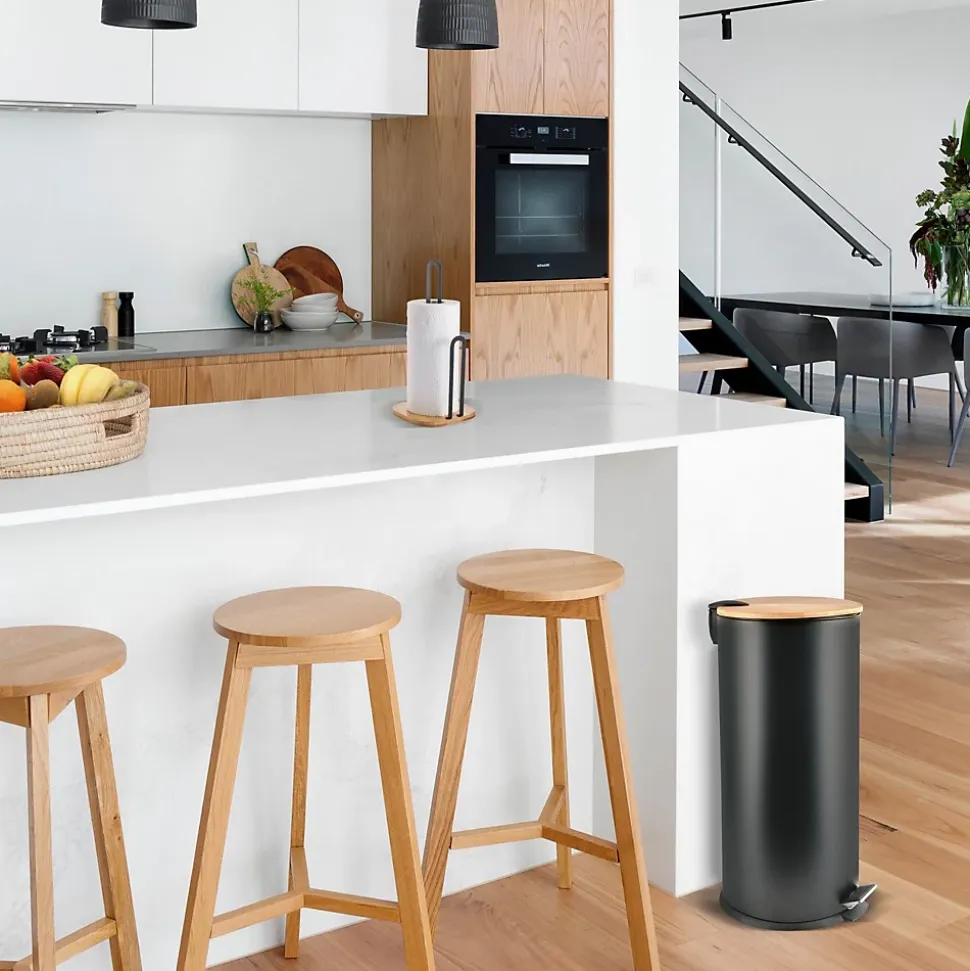 La poubelle à pédale moderne de la série ADONIS convient parfaitement à toutes les cuisines. Dotée d’un couvercle en bambou à fermeture douce de haute qualité.Ajoutez une touche d’élégance et de fonctionnalité à votre cuisine avec notre poubelle à pédale de 30 litres. Fabriquée en acier noir de haute qualité, elle est non seulement robuste mais aussi esthétiquement plaisante.- Mécanisme de Fermeture Lente : Profitez d’une fermeture douce et silencieuse grâce à notre mécanisme de fermeture lente. Fini le claquement bruyant des couvercles de poubelle classiques.- Revêtement Anti-trace de Doigts : Le revêtement spécial anti-trace de doigts garde votre poubelle impeccablement propre, éliminant les marques de doigts indésirables et facilitant l’entretien.- Couvercle en Bambou : Le couvercle en bambou ajoute une note naturelle et chaleureuse à votre cuisine tout en masquant habilement les déchets. Un mariage parfait entre fonctionnalité et esthétique.- Capacité de 30 Litres : Avec une généreuse capacité de 30 litres, cette poubelle est idéale pour les familles nombreuses ou les amateurs de cuisine qui génèrent beaucoup de déchets.- Design Moderne : Son design épuré et moderne s’adapte à tous les styles de cuisine, faisant de cette poubelle un ajout élégant à votre espace.Dimensions: 29,5x63cm Contenance: 30L Couleur: Noir Matière: Acier & Bambou