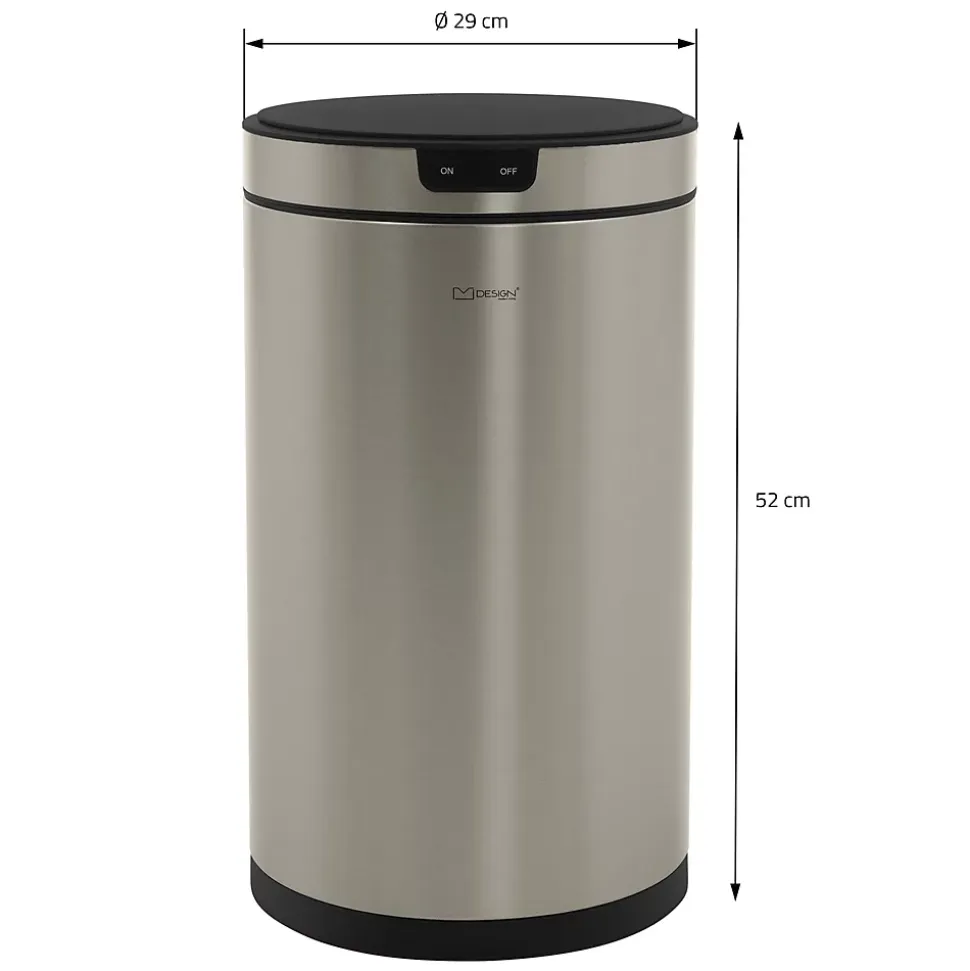 Poubelle avec capteur de mouvement – 30 litres en inox, moderne et hygiéniqueCette poubelle combine un design moderne avec un maximum de confort et d’hygiène. Grâce au capteur de mouvement intégré, le couvercle s’ouvre automatiquement dès qu’il détecte un mouvement – totalement sans contact et donc particulièrement hygiénique. Après un court compte à rebours de 5 secondes, le couvercle se referme doucement de lui-même.Le seau est en acier inoxydable de haute qualité avec une finition brillante au rouleau, tandis que le couvercle est en plastique ABS robuste. Le bouton ON/OFF permet de désactiver la fonction d’ouverture automatique si nécessaire. De plus, la poubelle à capteur dispose d’un mode maintien ouvert très pratique qui permet au couvercle de rester ouvert en permanence – idéal pour une utilisation prolongée, par exemple pour cuisiner.Avec son look élégant en acier inoxydable, la poubelle de 30 litres s’intègre parfaitement dans toute cuisine, bureau ou salle de bain moderne. AvantagesOuverture automatique: le capteur de mouvement détecte les mouvements et ouvre automatiquement le couvercle.Fermeture automatique: le couvercle se ferme automatiquement après un compte à rebours de 5 secondes. Livraison1x Poubelle avec capteur de mouvement (30 litres)(piles non incluses) Information techniqueMatériaux:Corps: acier inoxydable avec peinture au rouleauCouvercle: plastique ABSCouleur: Argent (gris)Finition: Brillant / aspect inoxVolume: 30 litresMode de fonctionnement: sur piles (4 piles AA, non fournies)Fonctions:Capteur de mouvement (ouverture automatique)Fermeture automatique après 5 secondesIndicateur de niveau de batterieMode maintenir ouvertBouton ON/OFFDimensions:Total: Ø 29 × H 52 cmDimensions intérieures: Ø 27,5 × H 47 cm