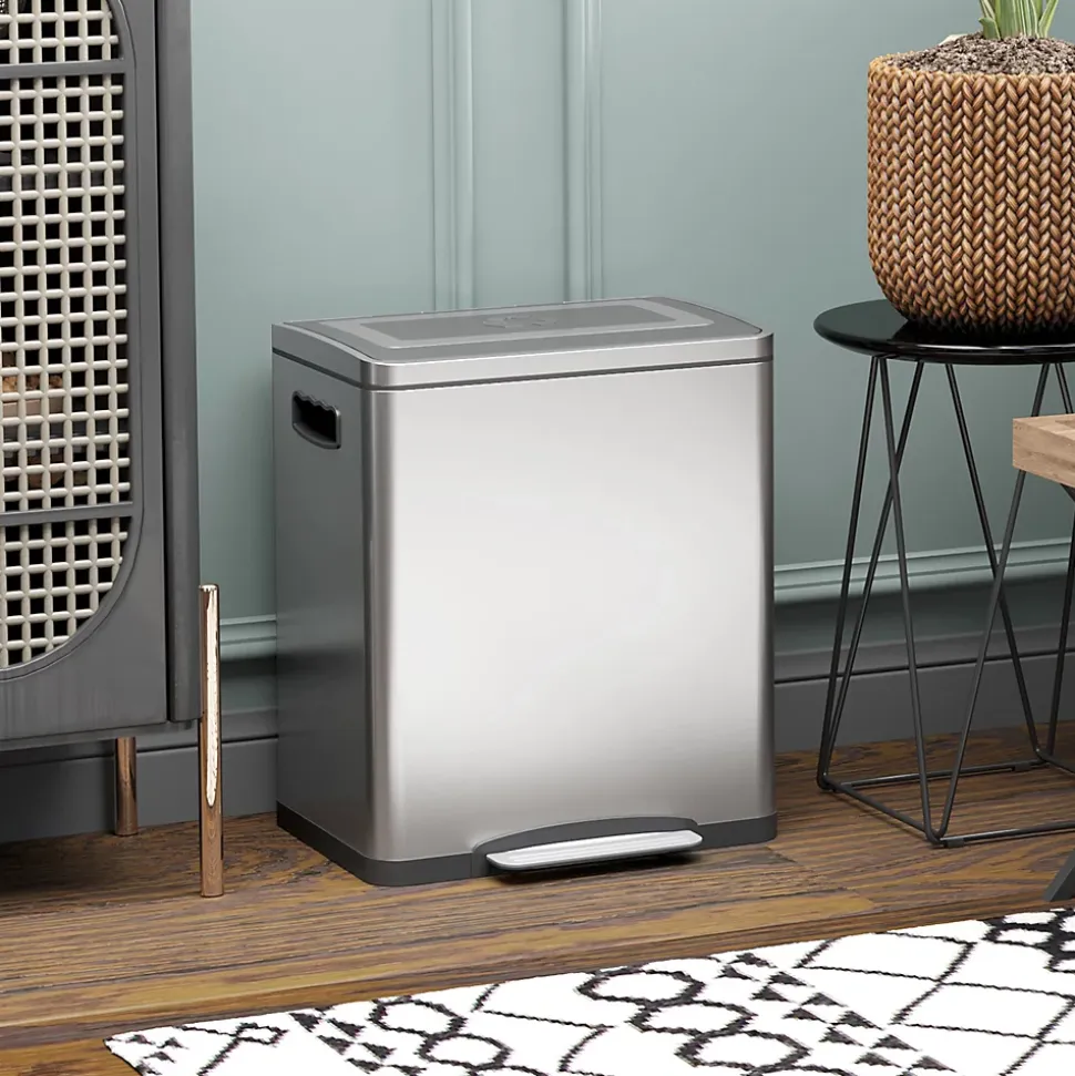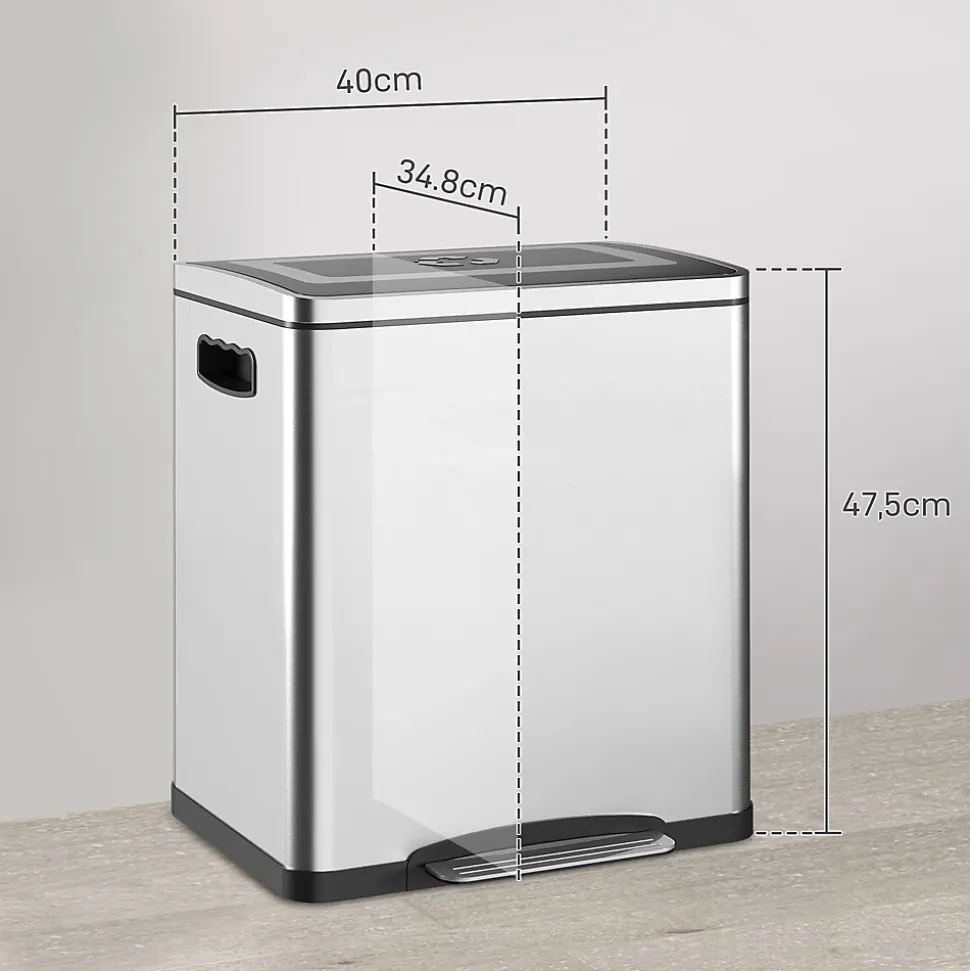 Optimisez votre cuisine avec la poubelle HOMCOM, comprenant deux compartiments de 15 litres pour trier facilement les déchets. En acier inoxydable anti traces, elle intègre un couvercle silencieux à fermeture douce et des bacs amovibles. Idéale pour les cuisines.Caractéristiques :- Poubelle de cuisine à pédale avec deux compartiments de 15L répondent aux besoins de tri sélectif des déchets- Poubelle de cuisine en acier inoxydable résistant aux traces de doigts conserve une apparence propre- Le couvercle à fermeture douce de la poubelle 30l de cuisine réduit le bruit à la fermeture- Les seaux amovibles simplifient le changement des sacs et le nettoyage- Des trous dans le seau intérieur maintiennent les sacs poubelle en place- Des poignées invisibles facilitent la mobilité- Aucun montage nécessaireSpécifications :- Couleur : argent- Matériaux : acier inoxydable 410, plastique PP- Dimensions totales : 40L x 34,8l x 47,5H cm- Volume : 2 x 15L- Réf. : 851-038V00SR
