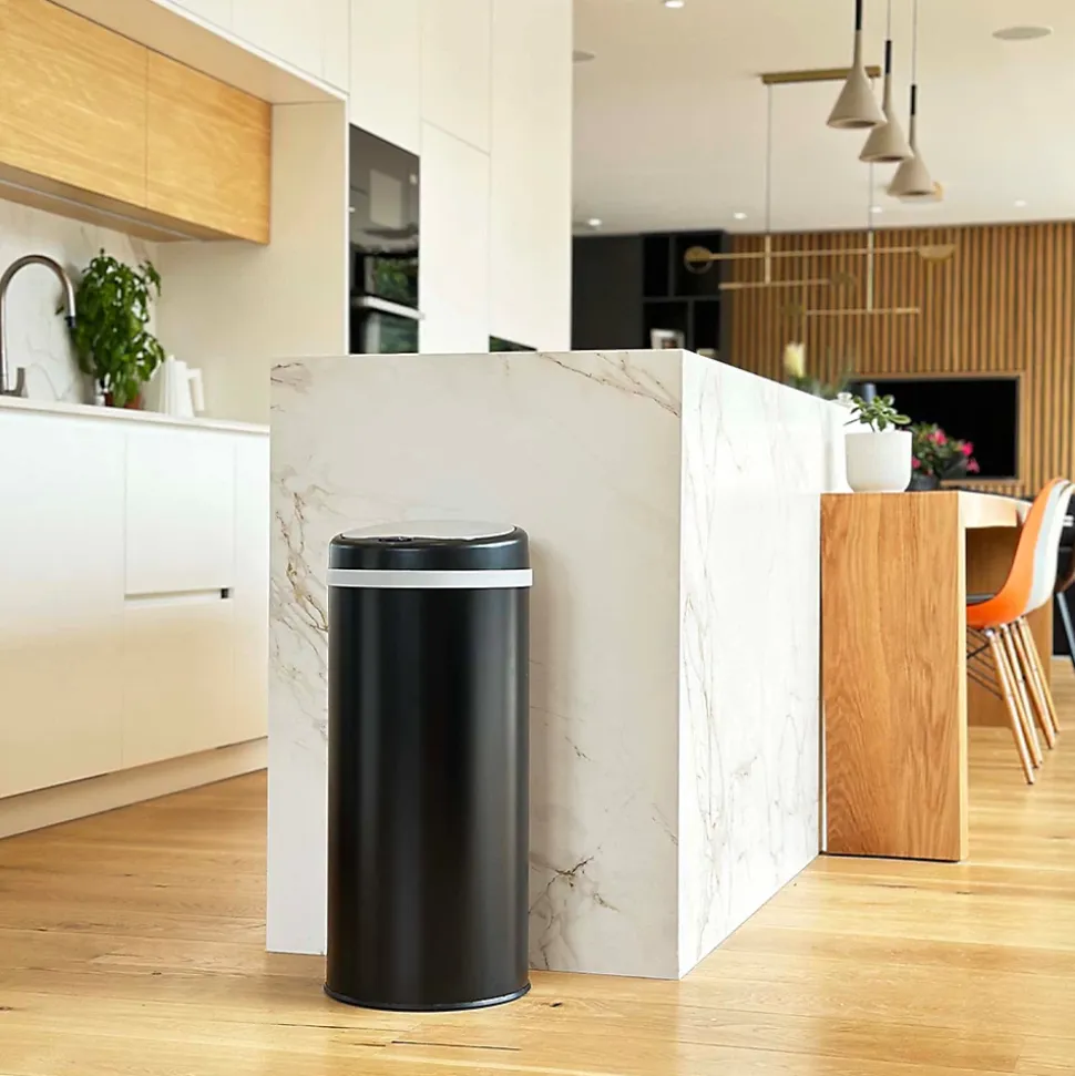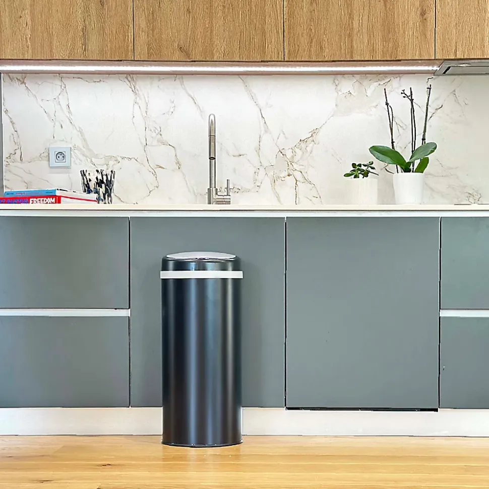- Poubelle de cuisine automatique ronde avec cerclage capacité 42 L modèle Soho en acier inoxydable. Dimensions : ∅ 31 x H. 70 cm. Poids : 3 kg. Couleur noir mat. Nouveau couvercle plus résistant et avec témoin de batterie faible.