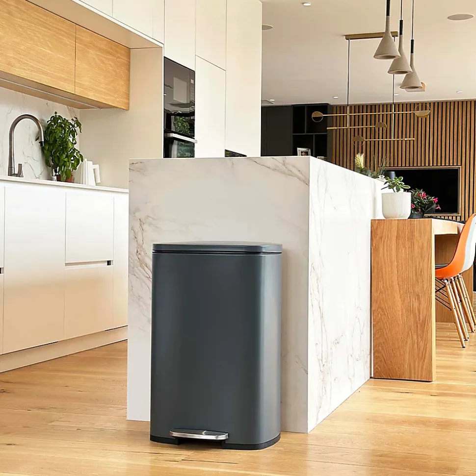 - Plus qu’une poubelle, un meuble design. Il n’est pas utile de se baisser pour jeter ses déchets. Poubelle Stable. Base antidérapante. Fermeture silencieuse et anti-traces de doigts. Cette poubelle a tout pour plaire. Nul besoin de la cacher dans un coin : faites-en un élément à part entière de votre déco. Idéal pour la cuisine, la salle de bain, le bureau, la chambre, la buanderie et tout autre endroit de passage où vous avez besoin d’une poubelle. Look moderne et élégant.
