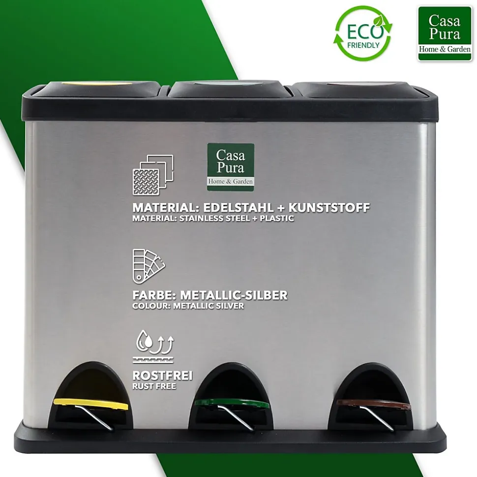 Poubelle « Brandon »Le système de tri des déchets est une poubelle élégante et pratique qui rend le tri des déchets amusant. Plusieurs compartiments (2 ou 3) sont disponibles pour trier vos déchets. La poubelle en acier inoxydable et en plastique a une capacité de 24, 36 ou 54 litres. Les seaux amovibles séparément ont une capacité de 8 ou 18 litres chacun.La poubelle est idéale pour trier les déchets ménagers quotidiens de manière.. Vous pouvez décider individuellement quel compartiment vous souhaitez utiliser pour quel type de déchets. Les compartiments du conteneur sont identifiés par un code couleur sur le dispositif à pédale. Chaque compartiment du système de tri s’ouvre avec sa propre pédale – les mains ne sont pas nécessaires. De plus, chaque compartiment du conteneur a son propre couvercle en plastique – il n’est donc pas nécessaire d’ouvrir tout le conteneur. Les seaux intérieurs peuvent être retirés séparément, ce qui facilite le vidage.Système de séparation des poubelles « Brandon » – Caractéristiques du produit :Marque: Matériau: acier inoxydable, plastique3 variantes : volume 24 l (3×8 l), volume 36 l (2×18 l) ou volume 54 l (3×18 l)Dimensions : 410x345x565 mm (variante à 2 compartiments), 470x283x395 mm (3 compartiments), 605x345x565 mm (3 compartiments)Seau intérieur amovible avec poignée de transport2 bacs intérieurs (pour 36 l) ou 3 bacs intérieurs (pour 24 l & 54 l)Système de séparation pour un tri optimal des déchets