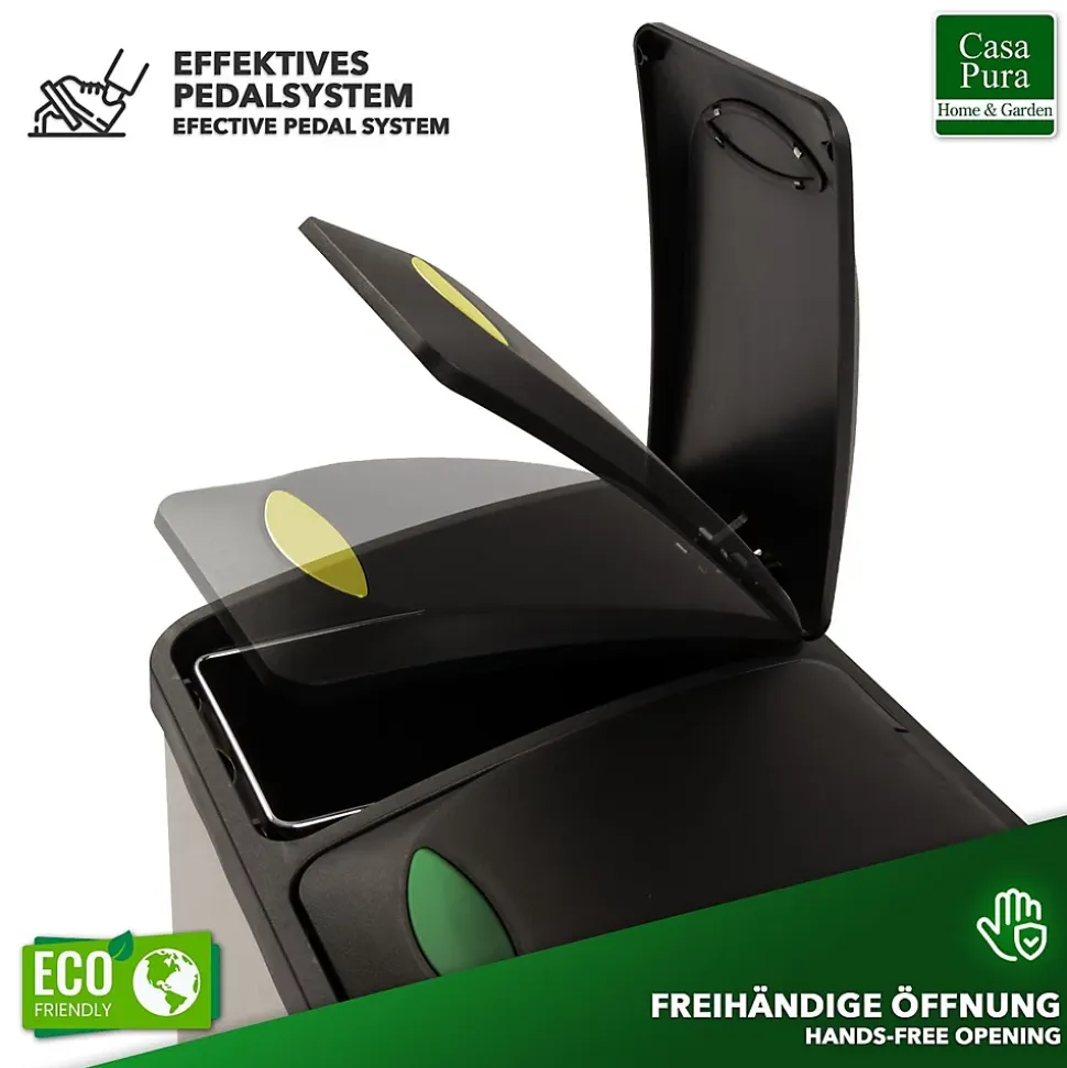 - Chaque compartiment s’ouvre avec sa propre pédale et dispose d’un couvercle individuel : pas besoin d’ouvrir toute la poubelle, moins de contacts, moins d’odeurs.