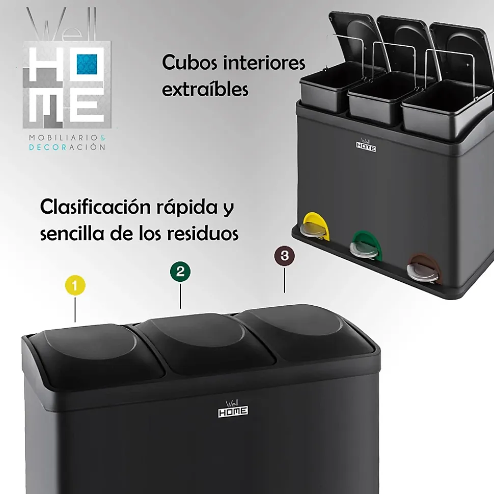 Poubelle de recyclage noire à 3 compartiments + sacs poubelle à fermeture automatique.- Cette poubelle a une capacité de 45 L. Elle est équipée de 3 pédales indépendantes pour chaque compartiment.Fabriquée en aluminium noir, chaque pédale est colorée (jaune, vert et noir) pour identifier facilement le type de déchet.Seaux intérieurs en plastique. Chaque compartiment de cette poubelle de recyclage permet le tri sélectif des déchets.Chaque bac a une capacité d’environ 15 L chacun. Cette poubelle s’intègre facilement à tous les espaces et environnements.- Livrée avec 20 sacs poubelle en polyéthylène à fermeture automatique, d’une capacité de 20 L.Spécialement conçue pour le tri sélectif : idéale pour les déchets organiques. Chaque sac mesure 45 x 55 cm.