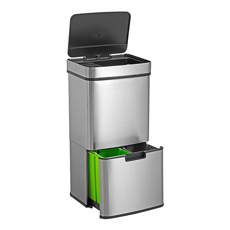 Poubelle de recyclage en acier inoxydable de 62 L.EFFICACE ET ORGANISÉE : Dotée de deux compartiments séparés, cette poubelle offre un volume total de 62 L, divisé en 37 L pour le compartiment supérieur et 25 L pour le compartiment inférieur (ce dernier pouvant accueillir un ou deux contenants). Le compartiment inférieur est équipé de roulettes. Ce dernier est équipé de deux bacs amovibles de 12,5 L.ROBUSTE ET ÉLÉGANTE : Son corps en acier inoxydable résistant aux traces de doigts allie robustesse et modernité. Sa forme rectangulaire lui confère une apparence élégante et s’intègre harmonieusement dans toutes les cuisines.OUVERTURE AUTOMATIQUE ET MANUELLE : Le compartiment supérieur peut s’ouvrir automatiquement ou manuellement. Le compartiment inférieur peut également s’ouvrir manuellement pour une gestion des déchets adaptée à vos besoins.PRATIQUE ET ACCESSOIRES : La fermeture silencieuse du couvercle assure un environnement de cuisine silencieux et une utilisation simplifiée. Un anneau en ABS assure un meilleur maintien des sacs.Dimensions : 42 x 31,5 x 74,5 cm – Fonctionne avec 6 piles AA (non fournies).