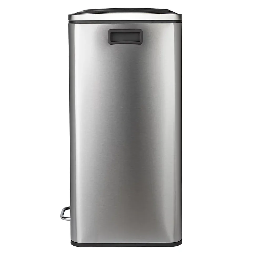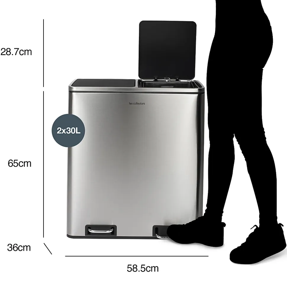 CAPACITÉ ET DIMENSIONS : Cette poubelle de tri à pédale offre une capacité totale de 60 L, répartie en deux compartiments de 30 L. Ses dimensions compactes de 58,5 x 36 x 65 cm s’intègrent facilement dans divers espaces.MATÉRIAUX ET DESIGN : Conçue en acier inoxydable avec une finition anti-traces de doigts, elle allie durabilité et élégance. Sa forme rectangulaire maximise l’utilisation de l’espace disponible.PRATICITÉ ET CONFORT : Les deux bacs intérieurs amovibles facilitent le tri des déchets et le nettoyage. Équipée d’une pédale en acier robuste, de pieds antidérapants et d’un couvercle à fermeture silencieuse, elle garantit une utilisation hygiénique et pratique.