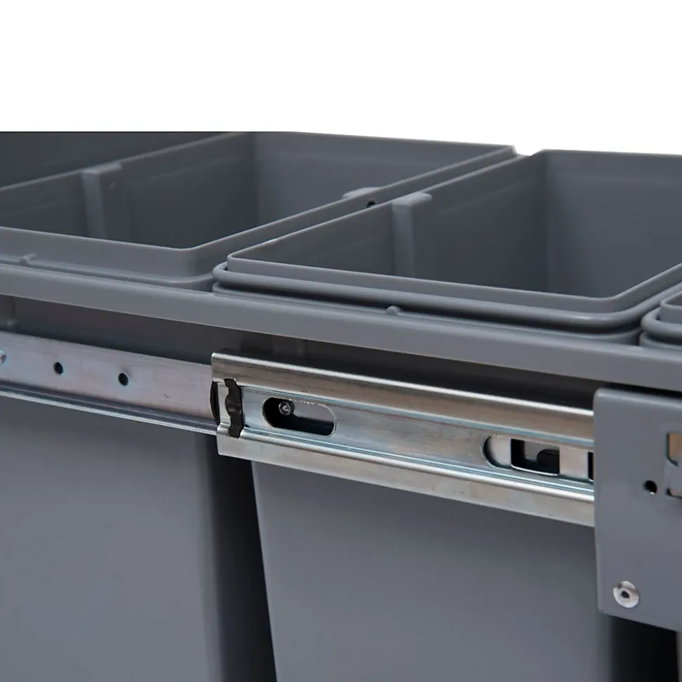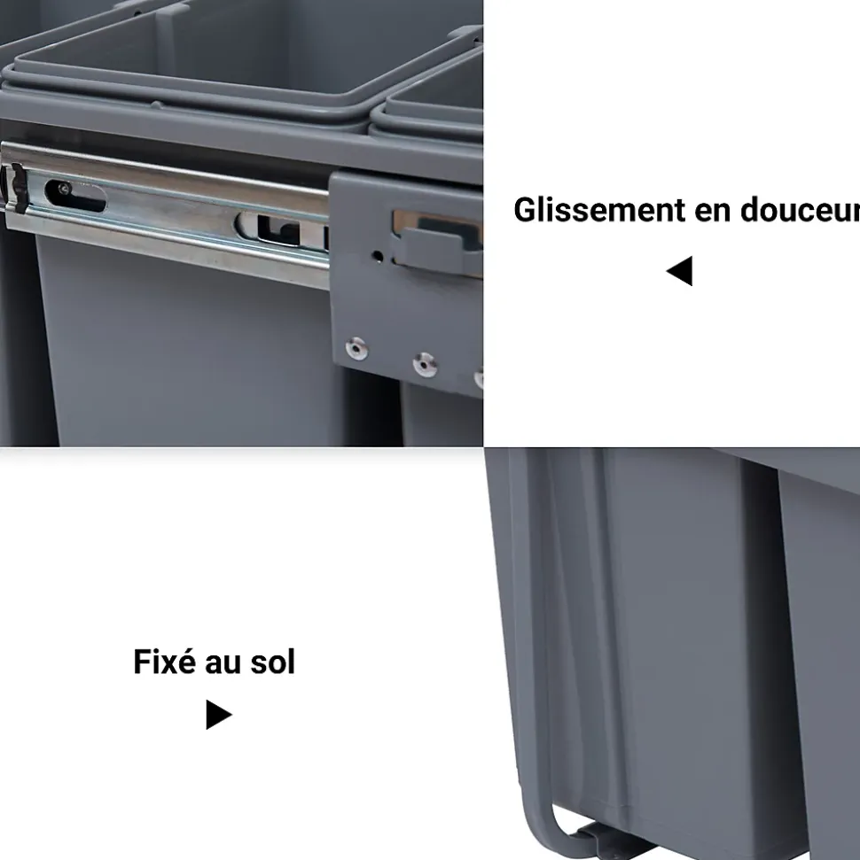 Cette poubelle de tri coulissante vous aidera à trier facilement vos déchets dans différentes poubelles. C’est un geste simple mais très important pour la valorisation de vos déchets.Caractéristiques :- Poubelle encastrable à glissière pouvant être installée dans un meuble bas de cuisine d’une profondeur minimale de 50 cm- Poubelle de tri coulissante pratique car dissimule les déchets derrière votre meuble de cuisine- Poubelle à glissière solide fixée à la base de l’unité pour plus de flexibilité- Mécanisme de fermeture en douceur pour une ouverture et une fermeture silencieuses- Equipée de 3 bacs internes recouverts : permet de dissimuler les déchets mais peut aussi être utilisés pour ranger de petits objets- Facile à nettoyer, à utiliser et à entretenir dans votre cuisine (chaque bac est amovible avec poignée)Spécifications :- Couleur : gris- Matériaux principaux : métal, ABS, PP- Dim. totales : 48L x 34,2l x 41,8H cm- Dim. grand bac : 30,5L x 22l x 36H cm- Dim. petits bacs : 22,5L x 15l x 36H cm- Volume total : 40L (2 x 10L et 1 x 20L)- Livraison en un colis- Réf. : 851-002