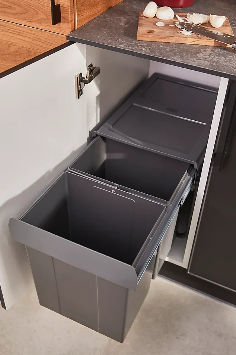 - Cette poubelle à glissière solide et de haute qualité est fixée à la base de l’unité pour plus de flexibilité et dissimule les déchets derrière votre meuble de cuisine