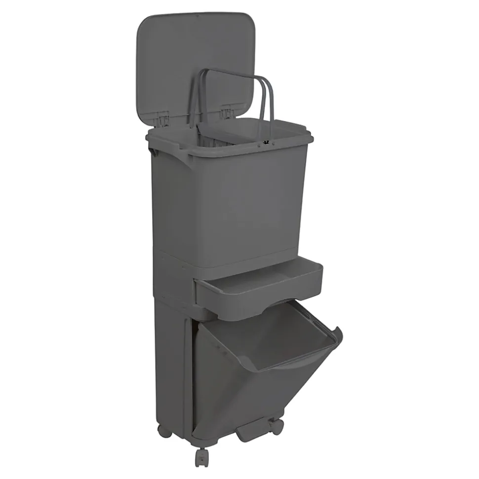Triple compartiment pour le tri sélectif, offrant trois compartiments distincts : un de 24 L, un de 4 L et un de 14 L, permettant de séparer facilement les différents types de déchets recyclables.Avec une grande capacité combinée de 42 litres, c’est la poubelle idéale pour un usage quotidien intensif tout en conservant un design compact.Séparation des déchets secs et humides. Ouverture en un clic. Robuste et durable.Molettes universelles incluses pour un déplacement facile. Système de pédale pour une ouverture simple et sans effort. Compartiments multifonctionnels pour une élimination facile des déchets.Met en place des crochets et des poignées latérales pour suspendre les sacs ou tenir la poubelle comme un chariot. Elle dispose également d’un tiroir intégré pour les petits accessoires ou les sacs poubelle.Avec ses dimensions compactes de 42 x 28,2 x 84 cm, elle est conçue pour s’intégrer parfaitement dans la poubelle et offre une grande capacité de rangement.