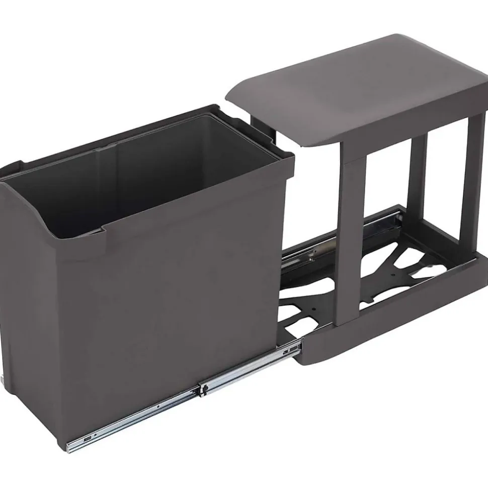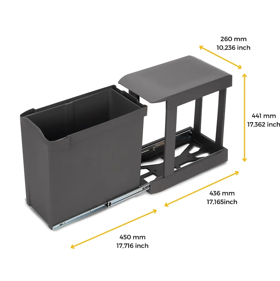 Aspect : Coloris = Gris anthracite • Matériau principal = Plastique • Dimensions : Hauteur (en cm) = 44,20 • Longueur (en cm) = 45,20 • Profondeur (en cm) = 26 • Autres caractéristiques : Composition = 1 cadre avec coulisses + 1 conteneur + vis de montage • Contenance (en L) = 30 • Informations complémentaires = Fixation par le bas , Coulissant automatique ou manuel , A installer dans les modules à ouverture droite ou gauche , Retrait du conteneur et ouverture du couvercle automatiques actionnés par la porte , Dispose d’un cadre avec coulisses à billes pour glisse en douceur , • Montage = A installer dans des modules de 40 cm pour installation automatique – dimensions internes minimales de 47.2 x 44.5 cm (PxH) ou des modules de 30 cm pour retrait manuel possibles • Poids (en kg) = 4,67 • Poubelle fixation inférieure et extraction automatique 30 L