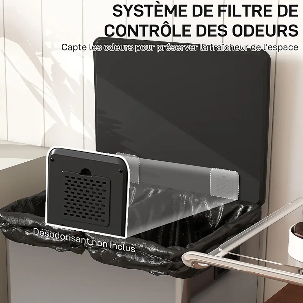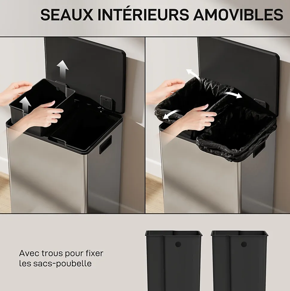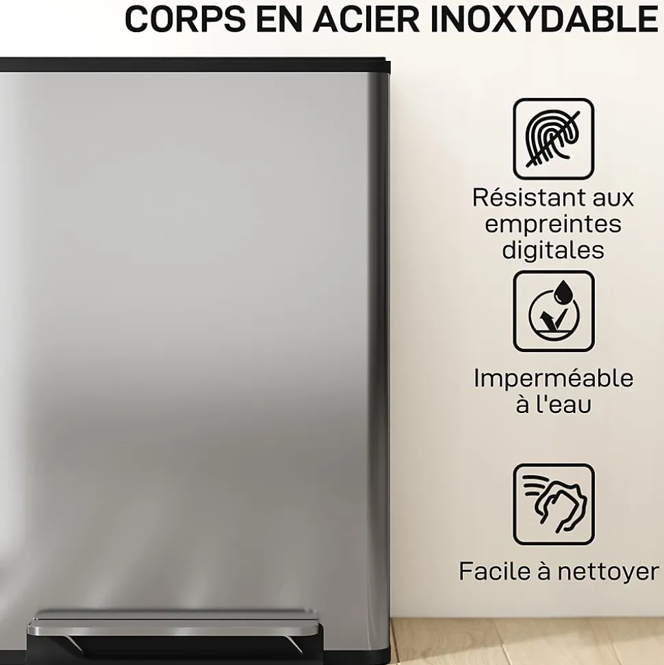 Fatigué du désordre dans votre cuisine ? Notre poubelle HOMCOM avec pédales offre deux compartiments pour un tri facile et un couvercle qui reste ouvert. Le corps en acier inoxydable brossé évite les traces, améliorant le style de la cuisine et apportant calme à votre quotidien.Caractéristiques :- Les deux compartiments de 30L de la poubelle facilitent grandement le tri et la séparation des déchets- La poubelle avec couvercle reste ouvert à 90° et se ferme doucement pour une opération silencieuse- La pédale à pied sans contact offre un moyen hygiénique d’ouvrir le couvercle- Finition en acier inoxydable anti-traces résistant aux marques, le gardant propre et comme neuf- Les seaux intérieurs amovibles permettent une élimination facile des déchets et un nettoyage approfondi- Cette poubelle rectangulaire comprend un filtre anti-odeurs intégré pour garder votre cuisine fraîche- Aucun montage nécessaire, utilisation immédiate possible !Spécifications :- Couleur : acier inox- Material: acier inox, ABS, PP- Dimensions totales : 47,5L x 37,5l x 67H cm- Dimensions du seau intérieur : 27L x 20l x 63H cm- Capacité : 60 l (2 x 30 l)- Hauteur max. ouverte : 98 cm- Réf. : 851-067V00SR