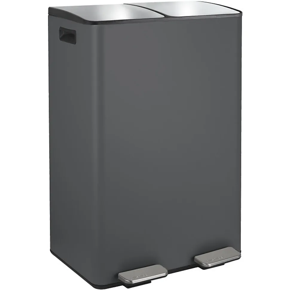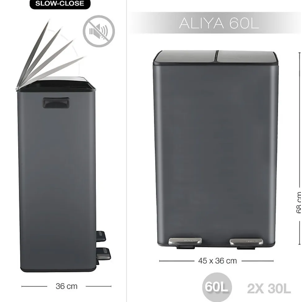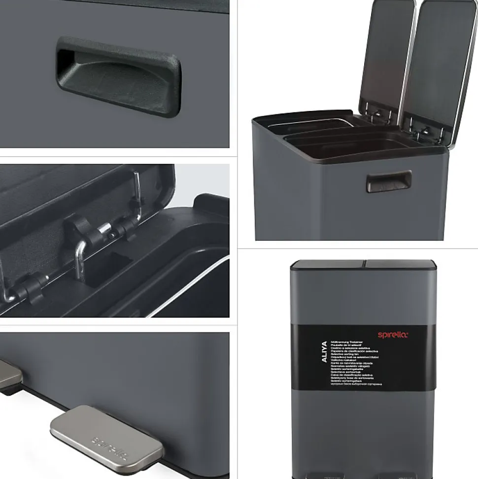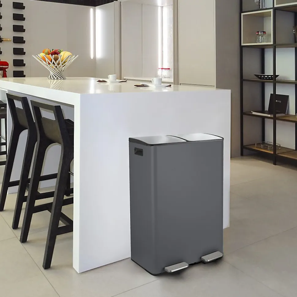 Poubelle de la marque SPIRELLATriez vos déchets avec simplicité.Notre poubelle de cuisine tri sélectif combine à la fois design élégant ainsi que toutes les fonctionnalités pour une gestion facile des déchets à la maison.C’est la version avec deux conteneurs intérieurs: 30L chacun.Ce séparateur de déchets permet de trier facilement les déchets. Confortable à utiliser, cette poubelle tri-selectif a tout pour plaire: 2 contenants de 20L parfaits pour la séparation des ordures rapide: papier, cartons, déchets alimentaires etc… Convient pour une utilisation en intérieur: poubelle de cuisine ou en extérieur : caves, Jardin, etc. C’est également un bon moyen d’apprendre les bases du recyclage à vos enfants.POUBELLE ERGONOMIQUE, TOUT EN DOUCEUR: Son couvercle ingénieux soft-close permet au couvercle de se fermer de manière douce et retient les mauvaises odeurs à l’intérieur.Les deux poignets extérieurs permettent de déplacer la poubelle en toute sécurité.MATÉRIAUX DE QUALITÉ: la poubelle est constituée d’acier de qualité supérieure garantissant une longue durée de vie ainsi qu’un aspect sobre et élégant. Les seaux amovibles, constitués de plastique recyclés sont faciles à nettoyer et transportable grâce à leur poignées.Dimensions: 45x30x68cm Contenant: 60L (2x30L) Couleur: Gris Mat & couvercle couleur inox. Matière: Acier