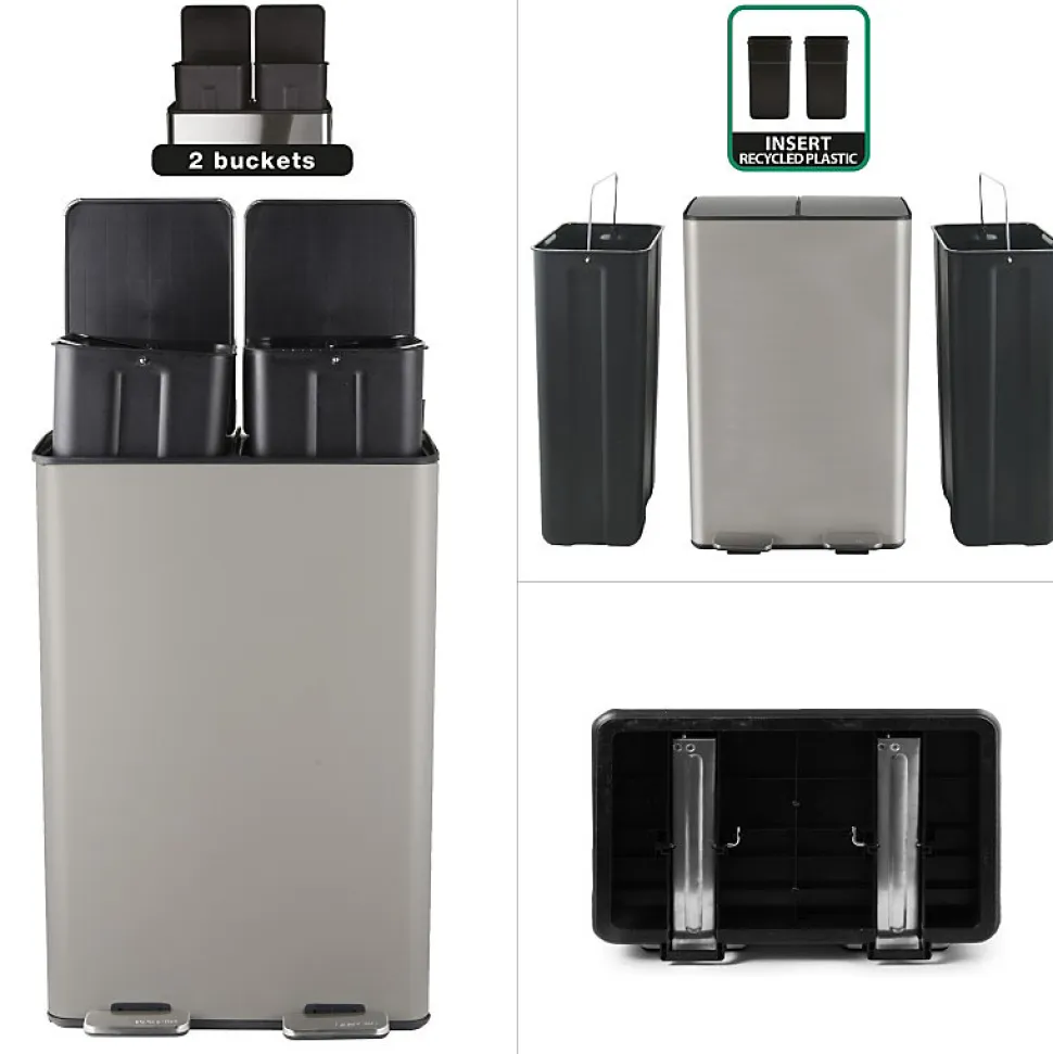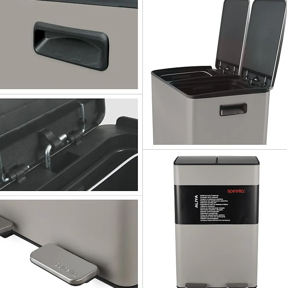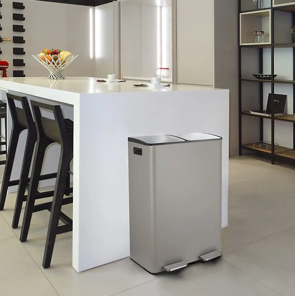 Poubelle de la marque SPIRELLATriez vos déchets avec simplicité.Notre poubelle de cuisine tri sélectif combine à la fois design élégant ainsi que toutes les fonctionnalités pour une gestion facile des déchets à la maison.C’est la version avec deux conteneurs intérieurs: 30L chacun.Ce séparateur de déchets permet de trier facilement les déchets. Confortable à utiliser, cette poubelle tri-selectif a tout pour plaire: 2 contenants de 20L parfaits pour la séparation des ordures rapide: papier, cartons, déchets alimentaires etc… Convient pour une utilisation en intérieur: poubelle de cuisine ou en extérieur : caves, Jardin, etc. C’est également un bon moyen d’apprendre les bases du recyclage à vos enfants.POUBELLE ERGONOMIQUE, TOUT EN DOUCEUR: Son couvercle ingénieux soft-close permet au couvercle de se fermer de manière douce et retient les mauvaises odeurs à l’intérieur.Les deux poignets extérieurs permettent de déplacer la poubelle en toute sécurité.MATÉRIAUX DE QUALITÉ: la poubelle est constituée d’acier de qualité supérieure garantissant une longue durée de vie ainsi qu’un aspect sobre et élégant. Les seaux amovibles, constitués de plastique recyclés sont faciles à nettoyer et transportable grâce à leur poignées.Dimensions: 45x30x68cm Contenant: 60L (2x30L) Couleur: Taupe & couvercle couleur inox. Matière: Acier