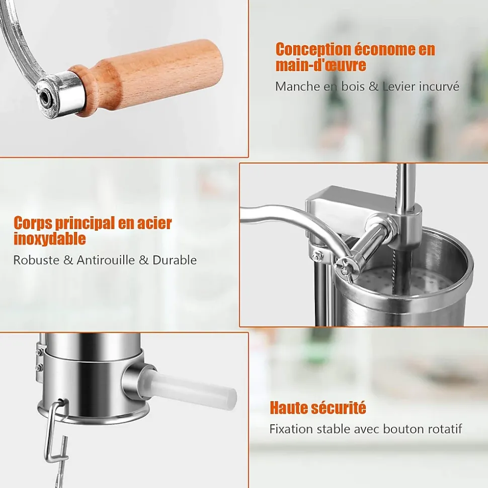 Bienvenue sur notre boutique en ligne. Notre machine à saucisses est fabriquée en acier inoxydable de haute qualité et en aluminium. Équipé de quatre tubes de différents diamètres, il permet de réaliser des saucisses de différentes tailles. Le levier ergonomique facilite votre processus de production. C’est une bonne aide pour votre cuisine sans causer de pollution sonore..N’hésitez plus, achetez-en un. Vous ne serez pas déçu.