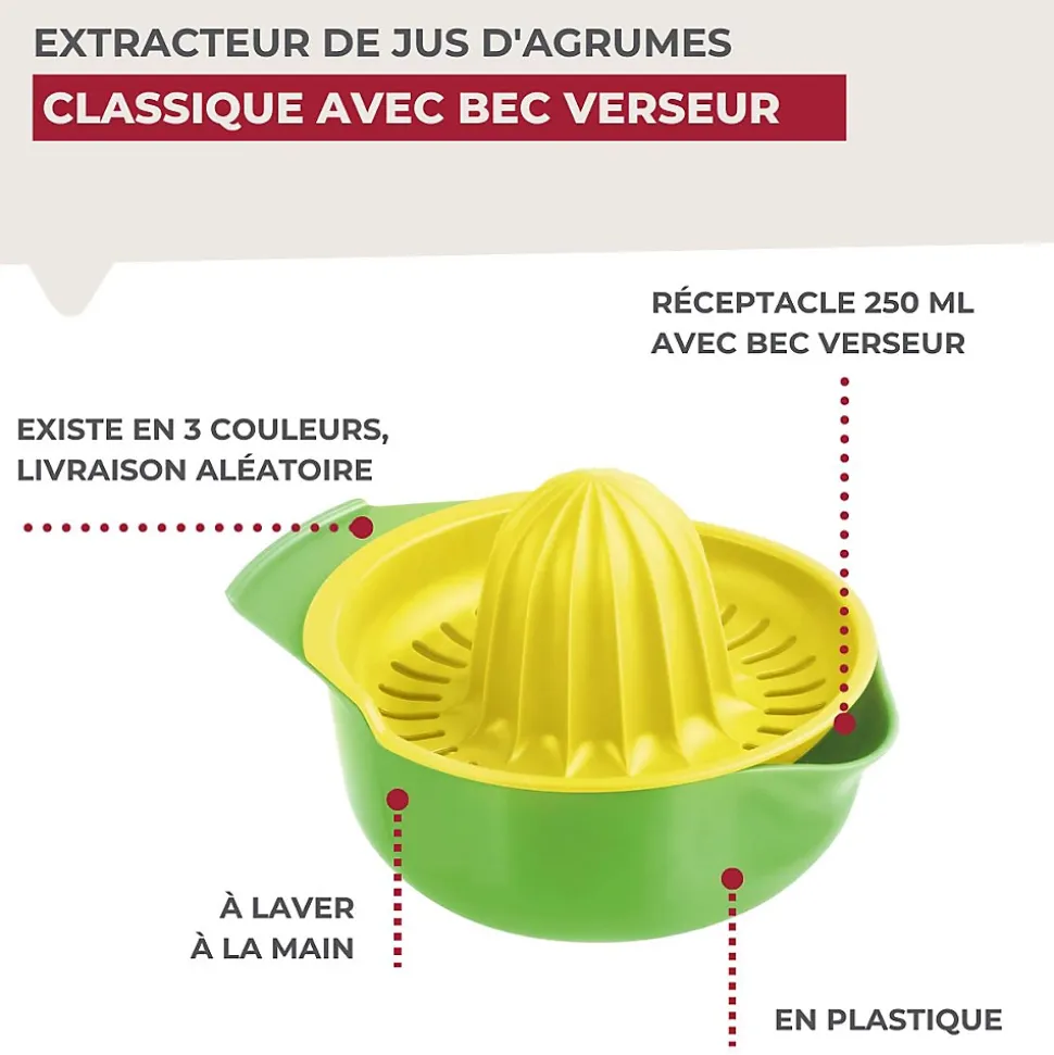 - CONTENU : 1 x presse-fruits blanc, jaune OU vert. Le coloris est aléatoire.