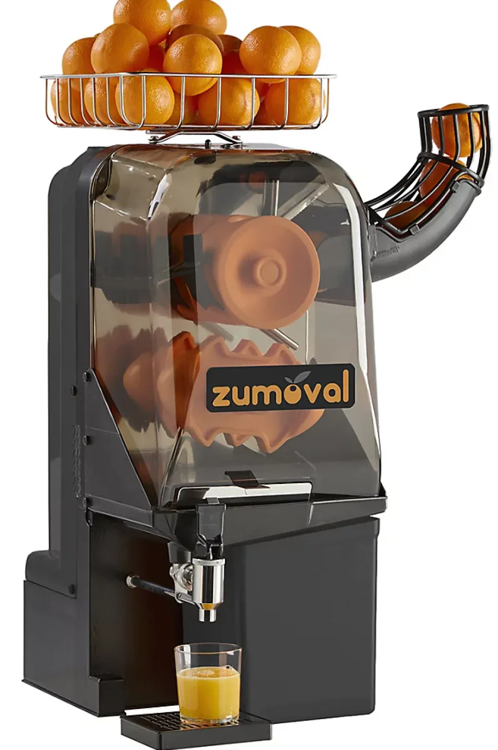 Presse-agrumes Minimax avec robinet libre-service inclus Presse-agrumes Minimax avec robinet libre-service inclus MINIMAX La plus petiteNos presses agrumes sont totalement automatiques: Il n’est pas nécessaire de couper les oranges en deux. Seulement les déposer dans le bac de fruits et la machine fera tout pour vous, á une grande vitesse. Notre système de rotation exclusif á un fonctionnement très attractif et visible, qui attire l’attention des consommateurs, ce qui augmente la demande de jus. Pendant le pressage, le jus n’a pas de contact avec la peau, ce qui évite la saveur amère.Équipé d’un moteur de 0,75 CV et équipé d’engrenages en acier, le modèle Minimax est certainement, comme le reste de la gamme Zumoval, la machine le plus résistant et robuste de la marché. La machine n’a pas besoin de entretien. Extrêmement intuitif et facile à utiliser. Rapide et facile à enlever pour le lavage. En seulement une minute la machine est prête pour le nettoyage que ne prend pas plus de 3 minutesLame d ‘acier inoxydable: coupe parfaite de l´orangeCapacité tube d’alimentation 6 fruits Système exclusif pressage rotatif Zumoval Sans contact avec la peauInstallation : sur tableCapot frontale très résistant Petit machine. idéal pour des endroits avec peu d´espace*Double filtre qui filtrent les graines * Inclus dans les machines avec l´option self service15 Fruits par minute 60 Litres par heure Petit machine. Idéal pour des endroits avec peu d´espace: Cafés, les bars à jus, bar à cocktails, petits hôtels, petits restaurants, …Production : 15 oranges par minute, soit 1 litre – Diamètre des oranges : 60 à 80 mm Alimentation manuelle – Capacité d’alimentation : 6 oranges Voltage (monophasé):230V. – 50/60 Hz Protection électrique :Surtension et température Sécurité:Détecteur inductif de proximite poids :51,3kgs Dimensions extérieures L x P x H : 330 x 450 x 740mm -Bacs a écorces 9 kg Voir les options pour en augmenter la capacité >OPTIONS DE LA MACHINE:ROBINET SELF SERVICE inclus