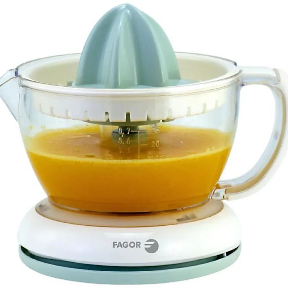 Découvrez le presse-agrumes électrique FAGOR FGPA07, puissant avec 40W et une capacité de 0,7L. Il dispose d’un réservoir transparent et gradué, d’un bec verseur pratique, de 2 cônes pour différents agrumes et d’un rangement pour le cordon.