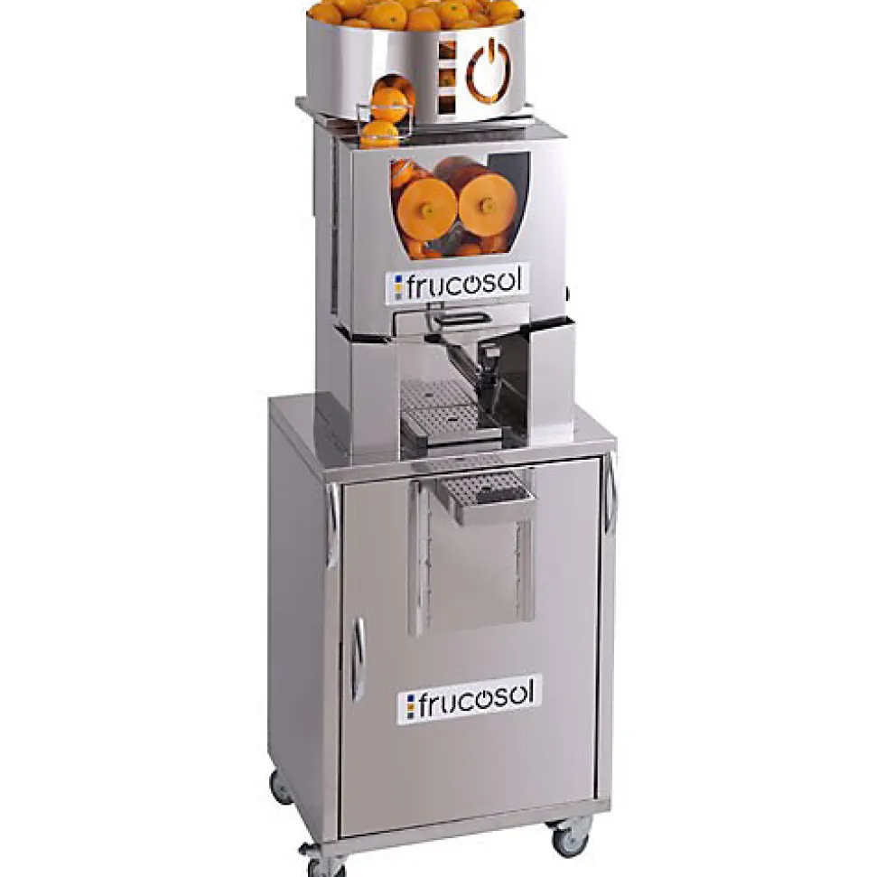Ce presse-agrumes compact à alimentation automatique est équipé d’un système automatique de marche/arrêt Il offre une production élevée de jus et une vitesse de pressage rapide. Qualité et rapidité rendent ce presse-agrumes la meilleure option de jus en self-service pour votre local.Le meuble offre la possibilité de réaliser un grand nombre de services sans se soucier des déchets produits. Il est équipé de roues pivotantes pour faciliter la mobilité.Il contient une grille de support réglable et un dispositif anti-gouttes. Le pressoir et le meuble sont tous deux fabriqués en acier inoxydable.Recommandé pour : buffets d’hôtels, self-services, universités, aéroports, marchands de fruits, supermarchés, magasins libre-service, hôtels et grandes surfaces.Caractéristiques techniques :Fruits par minute : 20-25 fruits/minCapacité du dispositif d’alimentation : 12 kg de fruitsDiamètre fruit : Jusqu’à 80 mmConsommation : 460 wVoltage 230-110 v / 50-60 HzSécurité : Capteurs d’arrêt automatiquePoids net : 95 kgDimensions : 58 L x 75 P x 162 H cmBac à déchet en inox inclus<span style= »color:#000000