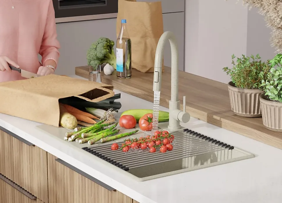 - ✅ STATION DE TRAVAIL MULTIFONCTIONNELLE – l’Évier est doté d’un rebord spécial sur lequel vous pouvez placer des Accessoires pour évier dédiés tels qu’un Égouttoir enroulable ou une planche à découper. Vous pouvez simultanément laver, couper et sécher les produits. Le grand Égouttoir minimaliste est idéal pour sécher même des ustensiles non standard. Il sera un endroit pratique pour les déposer avant le lavage, ce qui permettra de maintenir l’ordre autour de l’Évier.