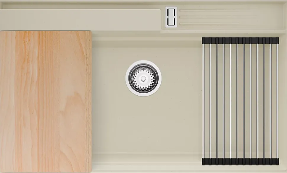- ✅ Le kit comprend – Évier Oslo 90 Pocket, kit complet de vidange (siphon haute qualité, trop-plein, raccordement supplémentaire pour lave-linge ou lave-vaisselle), égouttoir enroulable, planche à découper.