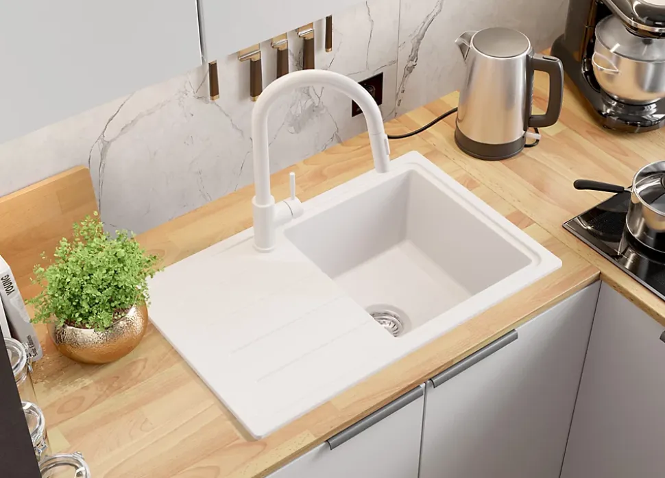 Évier Copenhague 700-45 Easy – Commodité maximale pour une petite cuisine Évier en granit Copenhague 700-45 Easy est un modèle un bac avec égouttoir, caractérisé par une cuve compacte aux dimensions de 336 mm x 360 mm x 200 mm. Malgré ses petites dimensions, l’évier dispose d’une cuve spacieuse et d’un égouttoir fonctionnel. Grâce à l’égouttoir profilé, vous gagnez de l’espace supplémentaire pour sécher la vaisselle sans perdre d’espace de travail sur le plan de travail. L’évier peut être installé dans des meubles d’une largeur à partir de 45 cm. Le kit comprend: Évier Copenhague 700-45 Easy, kit complet de vidange (siphon haute qualité, trop-plein, raccordement supplémentaire pour lave-linge ou lave-vaisselle).