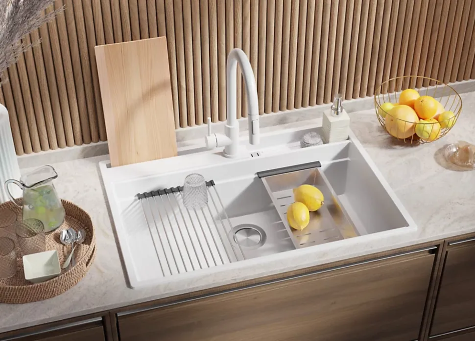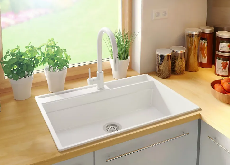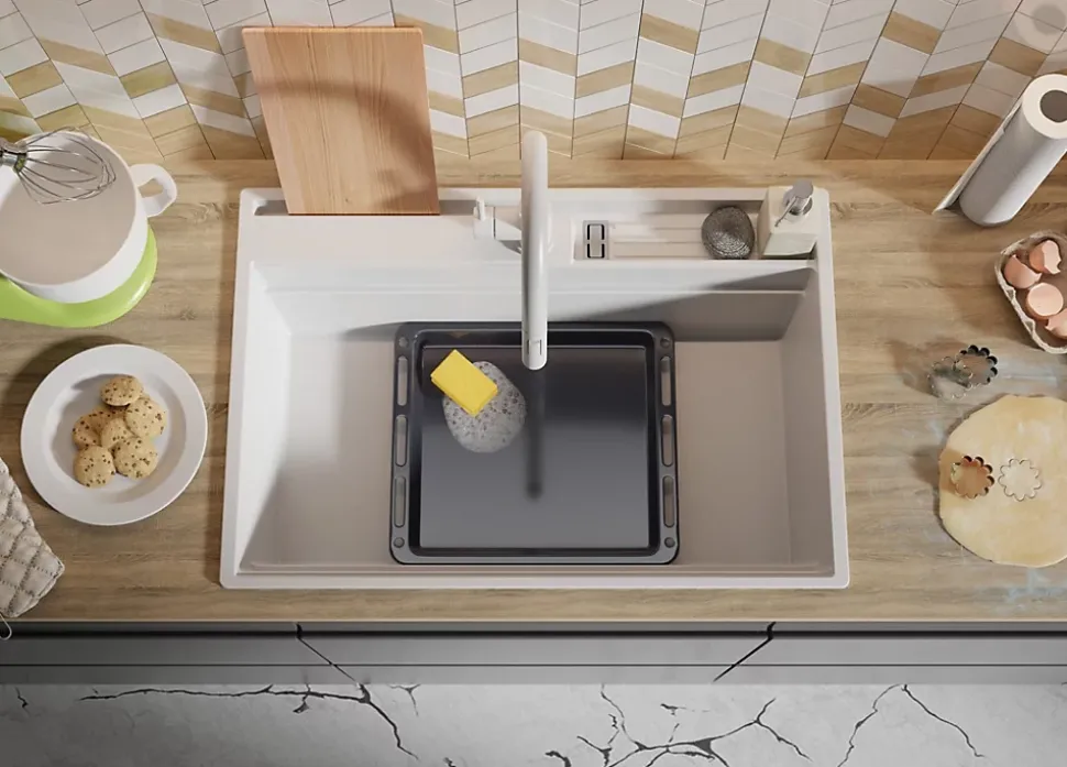 - ✅ Le kit comprend – Évier Oslo 80 Pocket Multilevel (Right), kit complet de vidange (siphon haute qualité, trop-plein, raccordement supplémentaire pour lave-linge ou lave-vaisselle), égouttoir enroulable, planche à découper.