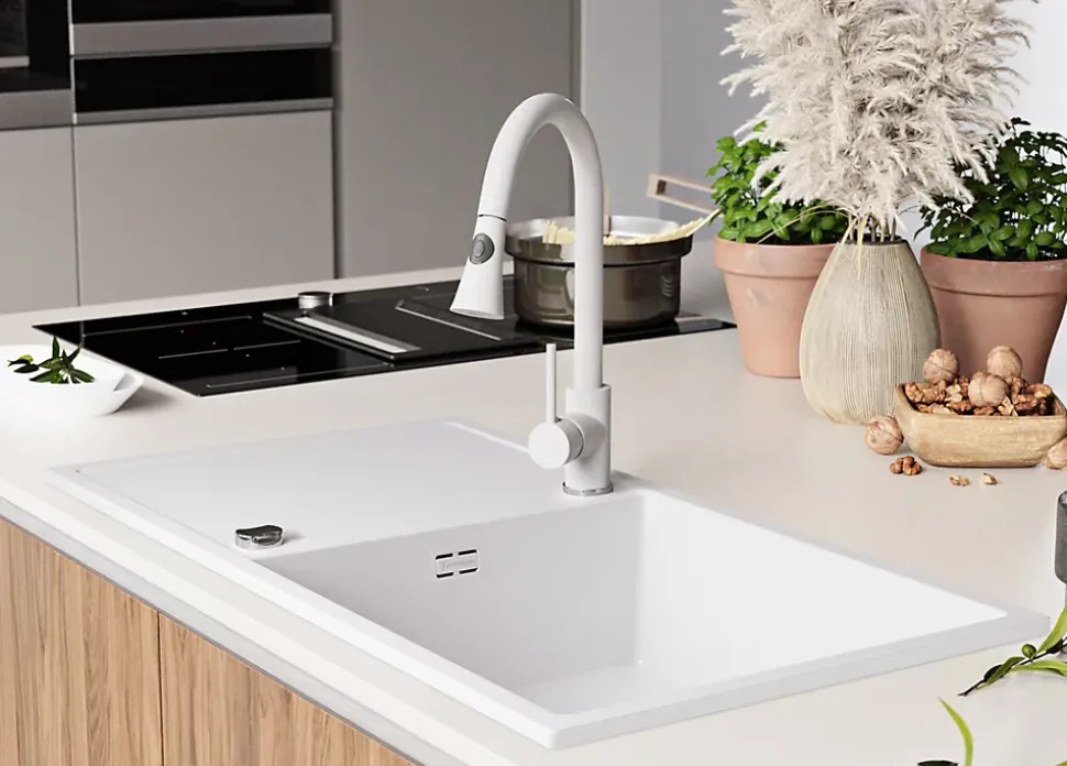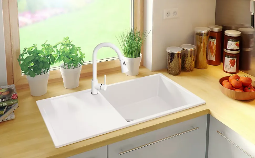 PRIMAGRAN Evier Cuisine en Granit Blanc 90x50cm, Lavabo 1 bac + Kit de Vidage, Évier à Encastrer au meuble 60cm – Ibiza