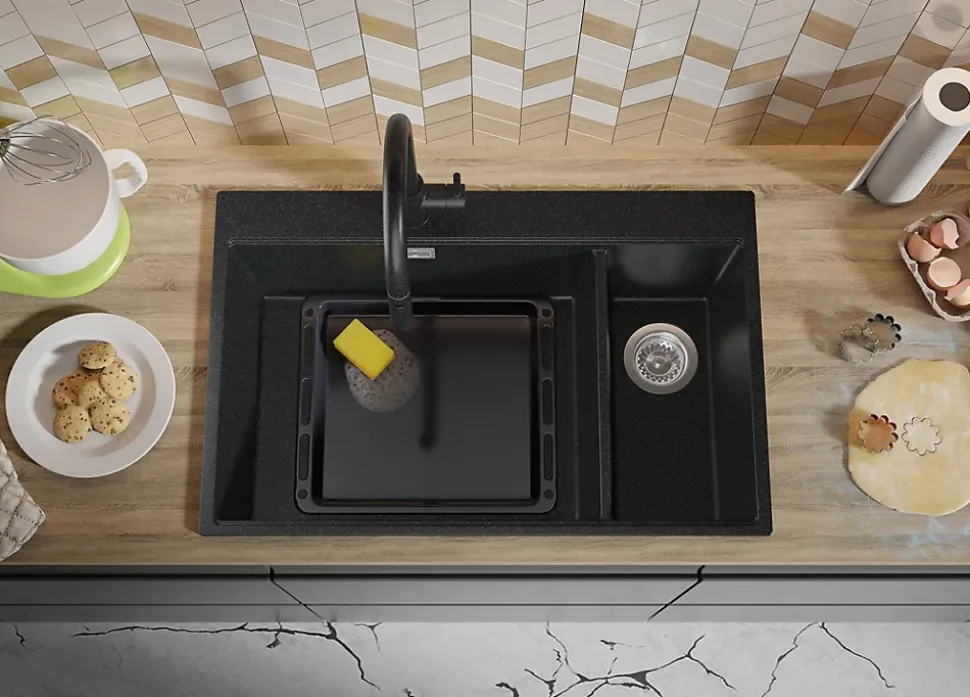 Évier en granit – Oslo 80 Duo Top – minimalisme pratique dans votre cuisine Le modèle Deux bacs Oslo 80 Duo Top présente une forme simple et minimaliste de grande taille. La double cuve offre plus d’espace pour le rangement de la vaisselle, ce qui est idéal pour ceux qui nécessitent plus d’espace. La possibilité de stocker simultanément la vaisselle sale tout en conservant de la place pour effectuer d’autres tâches le rend confortable et extrêmement pratique à utiliser. Le système Top – c’est-à-dire un rebord spécial – permet de placer de manière stable un égouttoir enroulable, un bac d’égouttage ou une planche à découper, qui s’aligne parfaitement avec le plan de travail, vous offrant encore plus d’espace de travail. La conception innovante de l’évier permet de rincer facilement les aliments, de sécher la vaisselle ou de couper au-dessus de l’évier. Vous pouvez désormais transformer votre évier en une station de travail multifonctionnelle, organisant un espace de travail supplémentaire dans la cuisine. L’évier Oslo 80 Duo Top peut être installé dans un meuble de 80, 90 cm et plus. Le kit comprend: Évier Oslo 80 Duo Top, kit complet de vidange (siphon haute qualité, trop-plein, raccordement supplémentaire pour lave-linge ou lave-vaisselle), planche à découper.