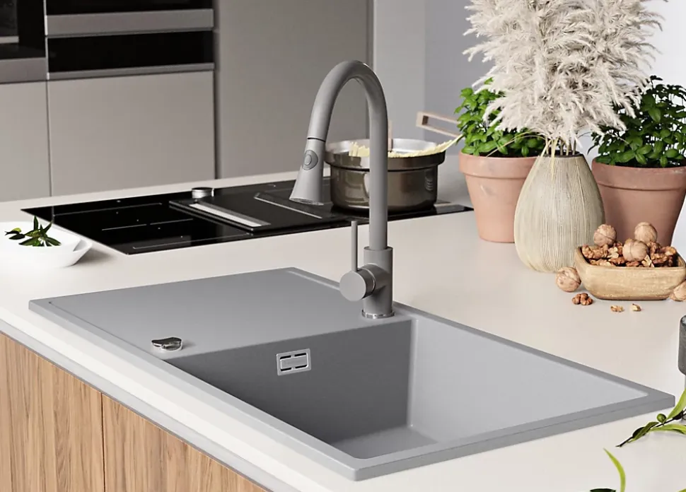 PRIMAGRAN Evier Cuisine en Granit Gris 90x50cm, Lavabo 1 bac + Kit de Vidage, Évier à Encastrer au meuble 60cm – Ibiza