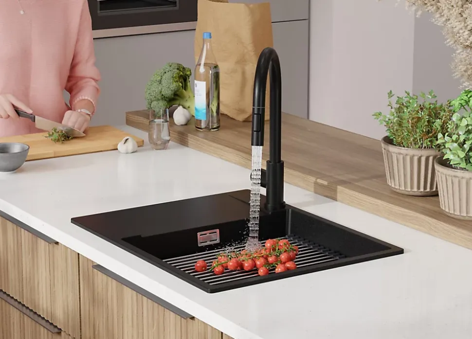 PRIMAGRAN Evier Cuisine en Granit Noir 62x50cm, Lavabo 1 bac + Kit de Vidage + Accessoires, Évier à Encastrer au meuble 50cm