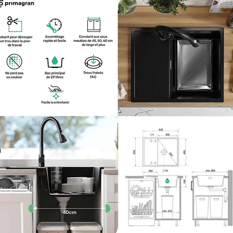 - ✅ Le kit comprend – Évier Ibiza 620-45, kit complet de vidange (siphon haute qualité, trop-plein, raccordement supplémentaire pour lave-linge ou lave-vaisselle).