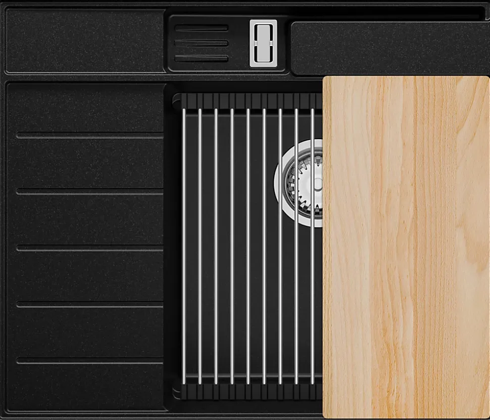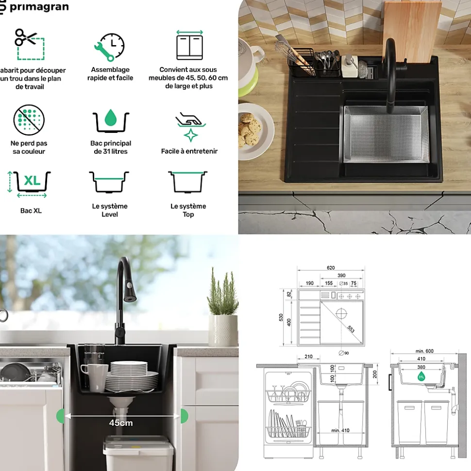 PRIMAGRAN Evier Cuisine en Granit Noir 62x53cm, Lavabo 1 bac + Kit de Vidage + Accessoires, Évier à Encastrer au meuble 45cm