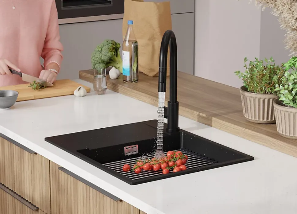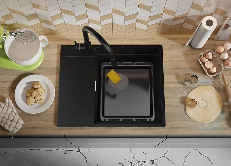 - ✅ Le kit comprend – Évier San Francisco 620-50 Level, kit complet de vidange (siphon haute qualité, trop-plein, raccordement supplémentaire pour lave-linge ou lave-vaisselle), égouttoir enroulable.