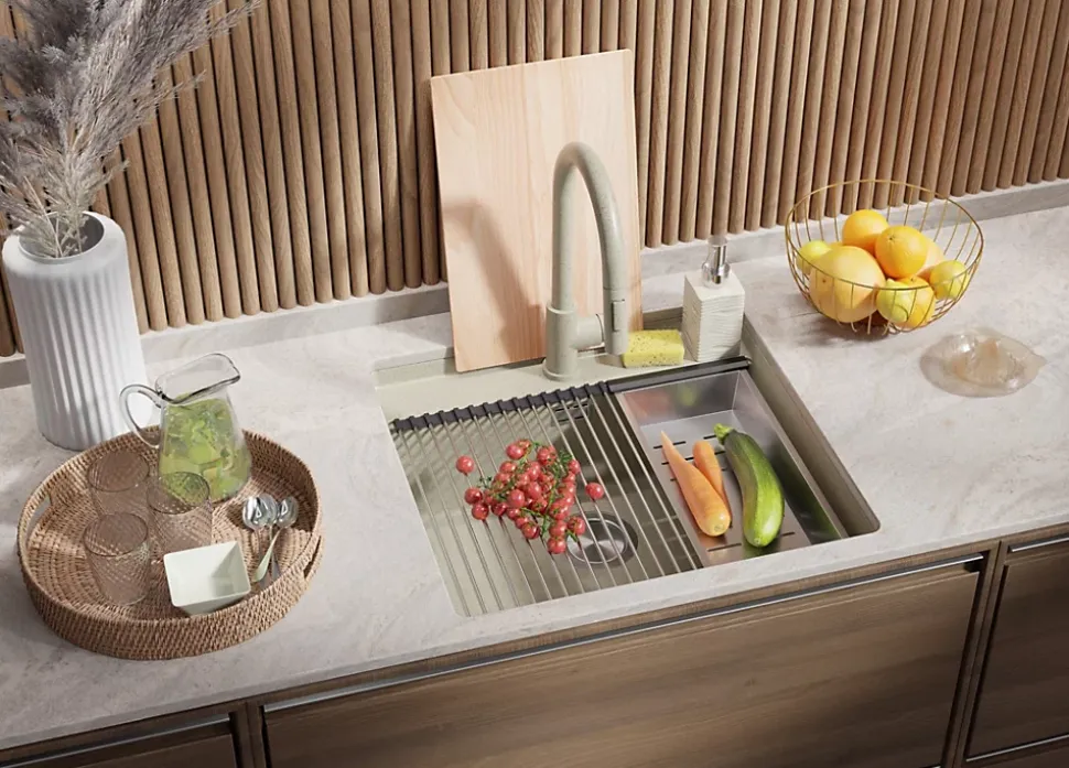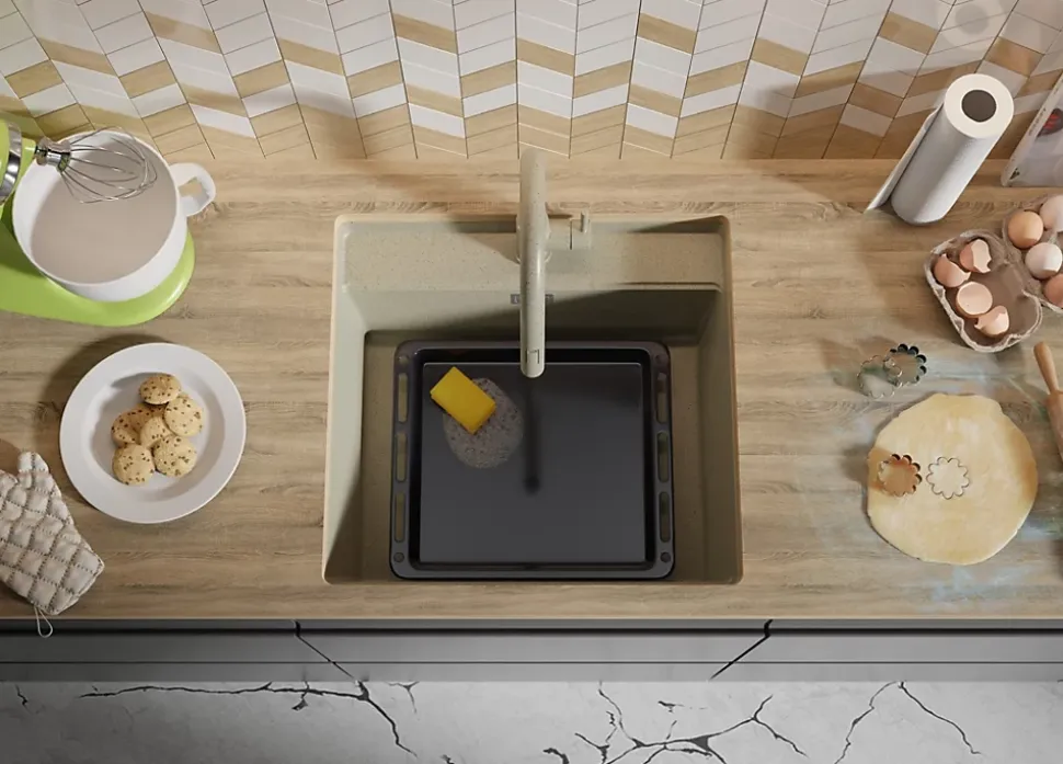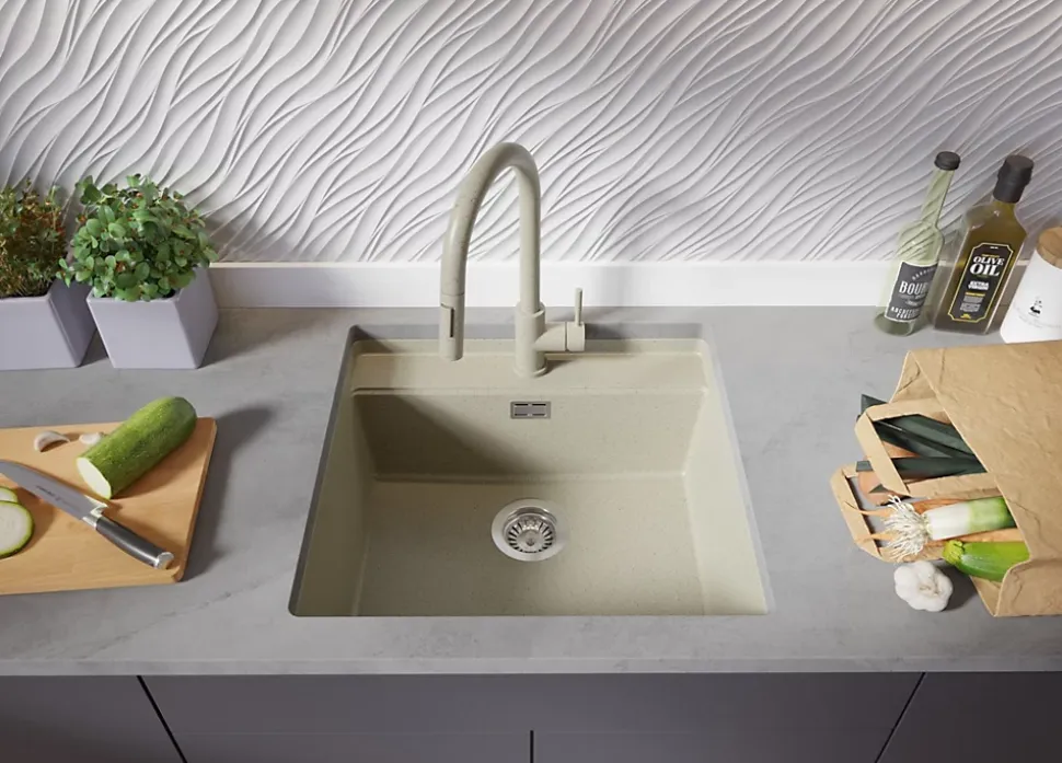 - ✅ Le kit comprend – Évier Bergen 60 Low Cut Top, robinet de cuisine Primagran 9010 beige avec Bec extractible et 2 types de jet, kit complet de vidange (siphon haute qualité, trop-plein, raccordement supplémentaire pour lave-linge ou lave-vaisselle), flexibles de raccordement 3/8” de 400 mm, double joints d’étanchéité, planche à découper.