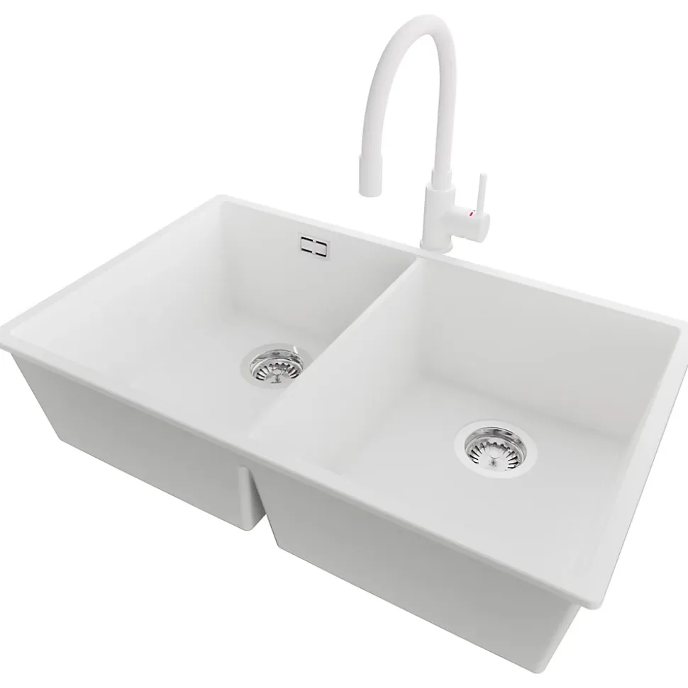 - ✅ Le kit comprend – Évier London 80 Twin, robinet de cuisine flexible Primagran 6030 blanc avec Bec extractible, kit complet de vidange (siphon haute qualité, trop-plein, raccordement supplémentaire pour lave-linge ou lave-vaisselle), flexibles de raccordement 3/8” de 400 mm, double joints d’étanchéité.