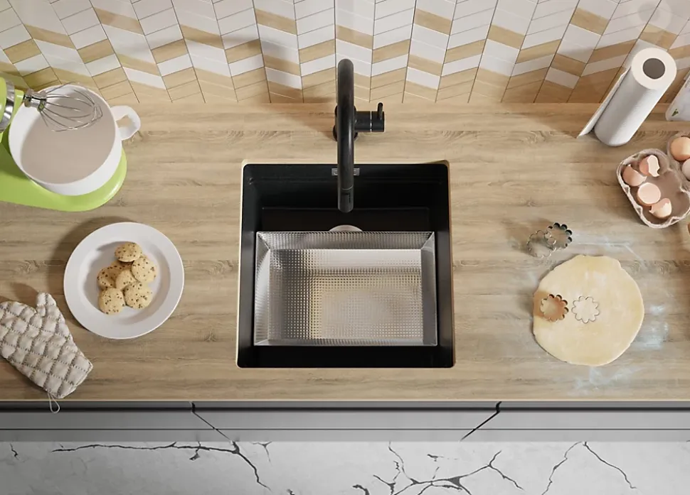 PRIMAGRAN Evier Sous Plan Graphite 46x47cm, Evier en Granit 1 bac + Kit de Vidage + Accessoires, Évier au meuble 50cm – Prague