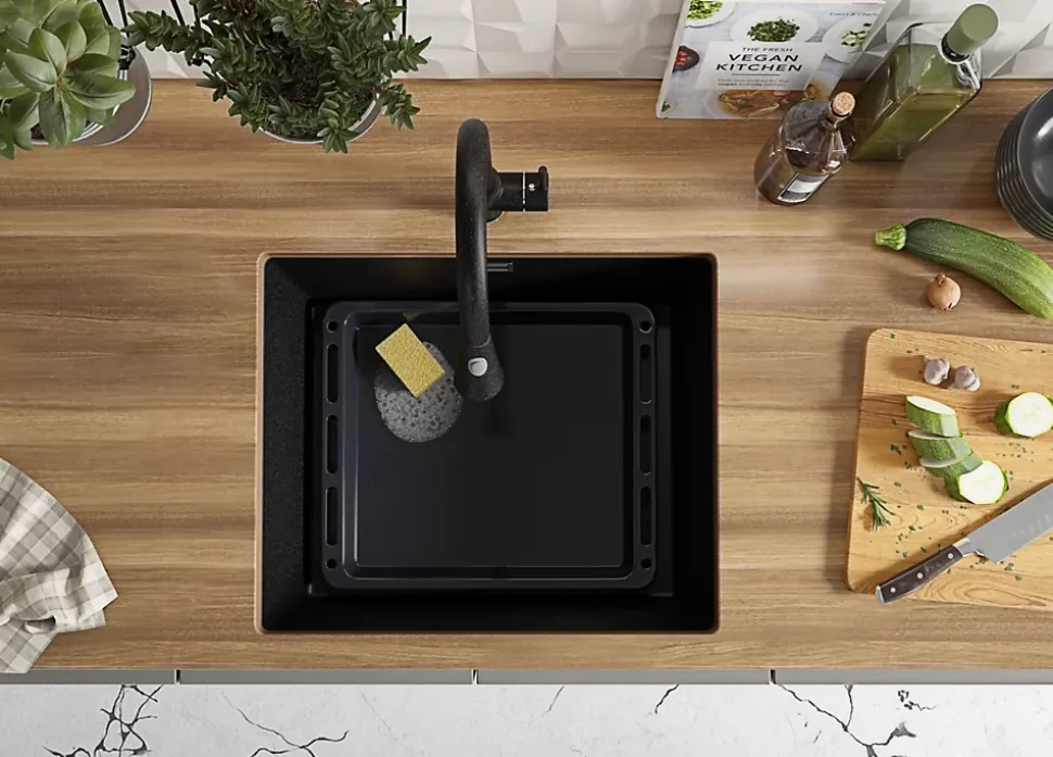 PRIMAGRAN Evier Sous Plan Graphite 56x47cm, Evier en Granit 1 bac + Kit de Vidage, Évier au meuble 60cm – London