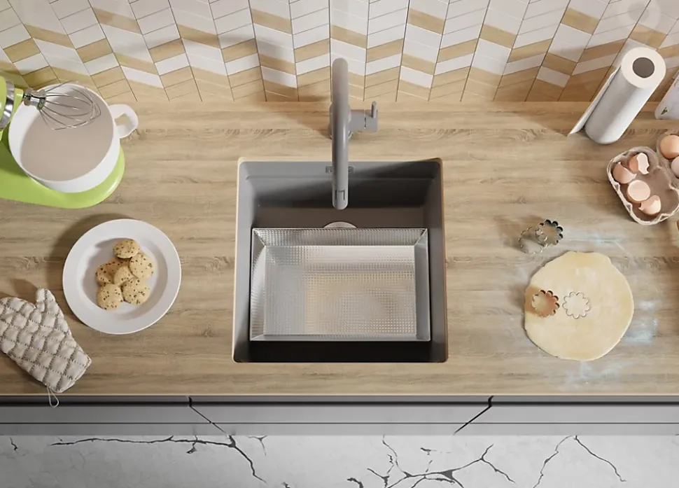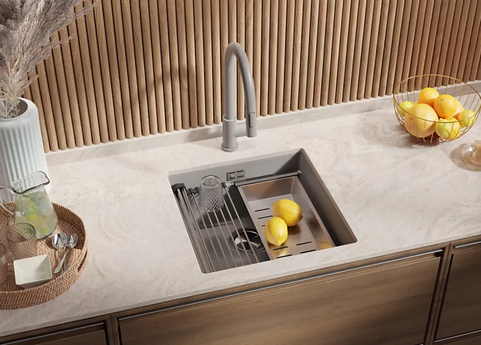 - ✅ Le kit comprend – Évier Prague 50 Level, kit complet de vidange (siphon haute qualité, trop-plein, raccordement supplémentaire pour lave-linge ou lave-vaisselle), égouttoir enroulable.