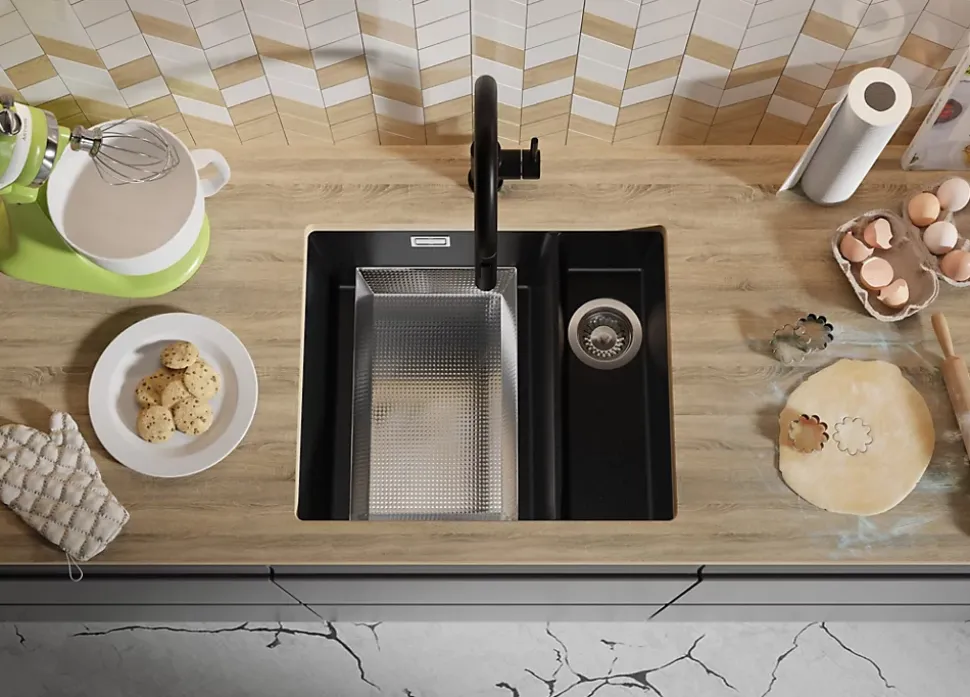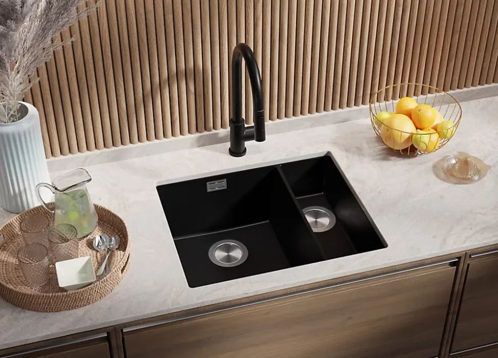 PRIMAGRAN Evier Sous Plan Noir 56x47cm, Evier en Granit 1,5 bacs + Kit de Vidage, Évier au meuble 60cm – London Duo