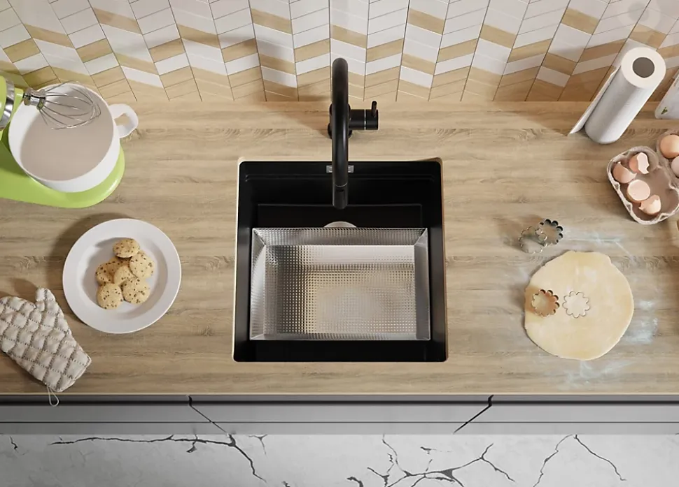 PRIMAGRAN Evier Sous Plan Tout Noir 46x47cm, Evier en Granit 1 bac + Kit de Vidage + Accessoires, Évier au meuble 50cm – Prague