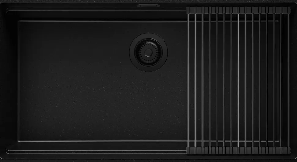 PRIMAGRAN Evier Sous Plan Tout Noir 86x47cm, Evier en Granit 1 bac + Kit de Vidage + Accessoires, Évier au meuble 90cm – Prague